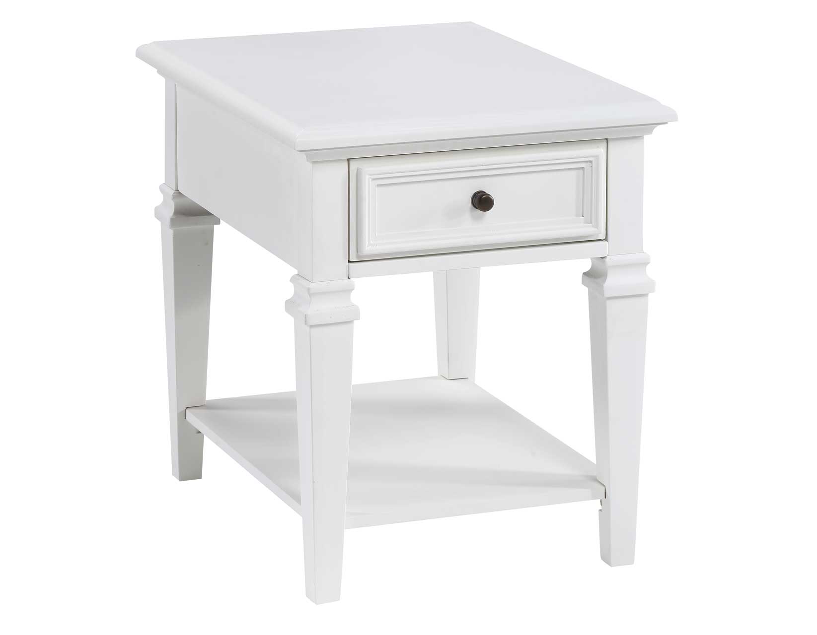 Modern farmhouse design in a compact design that fits comfortably beside a chair or as a companion piece to a Sofa and Loveseat. This Charlestown table offers looks and function with a pop-up power strip that offers convenient recharging of devices with a built-in USB recharging station. All of this is a crisp white finish with louvered doors and contemporary bun foot in a transitional package that will fit in any room.