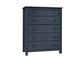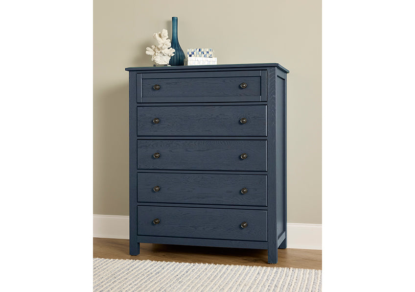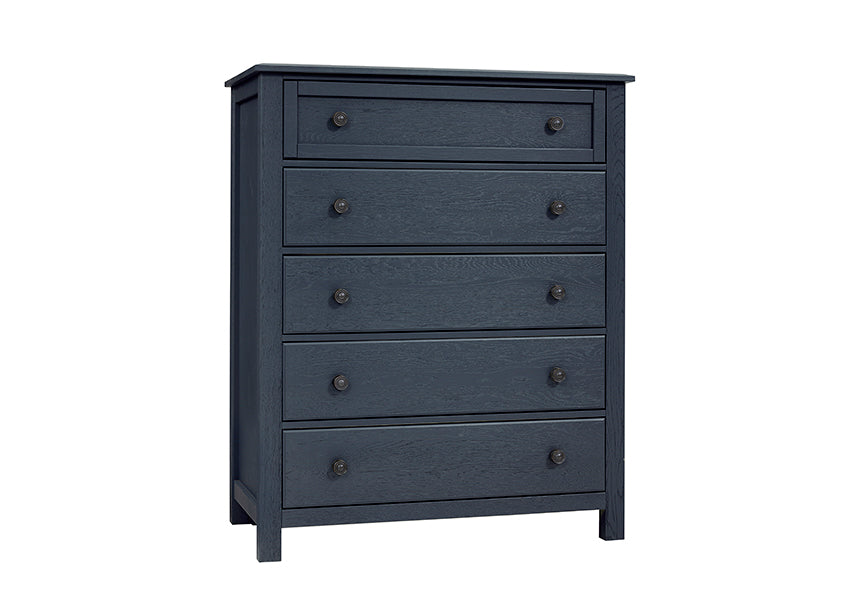 Made in the USA; this chest with five drawers shown in a indigo finish offers casual style to any bedroom in your home. Made from solid American White Oak. Available in 5 quick ship finishes.