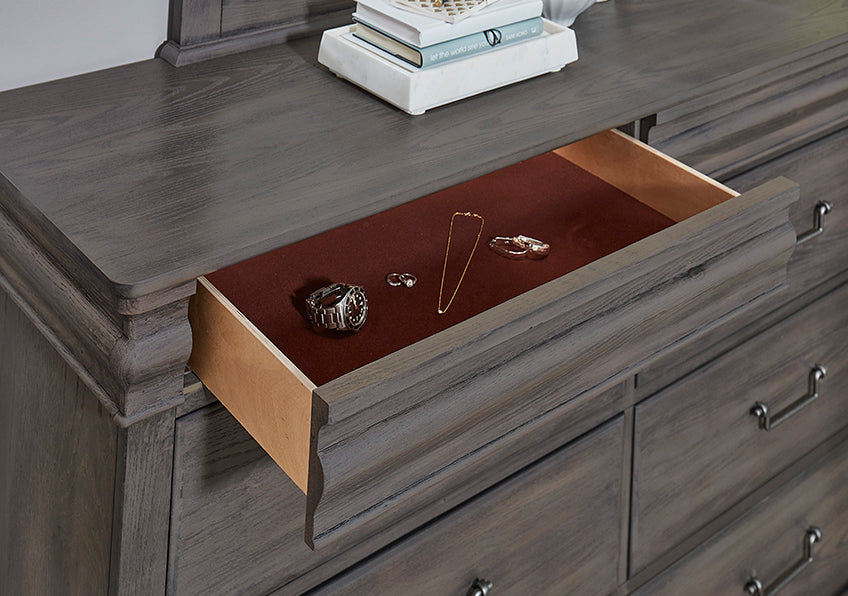 A classic five drawer chest for any master bedroom. Louis Philippe inspired design features a felt-lined drawer hidden behind the shaped molding at the top of the chest.