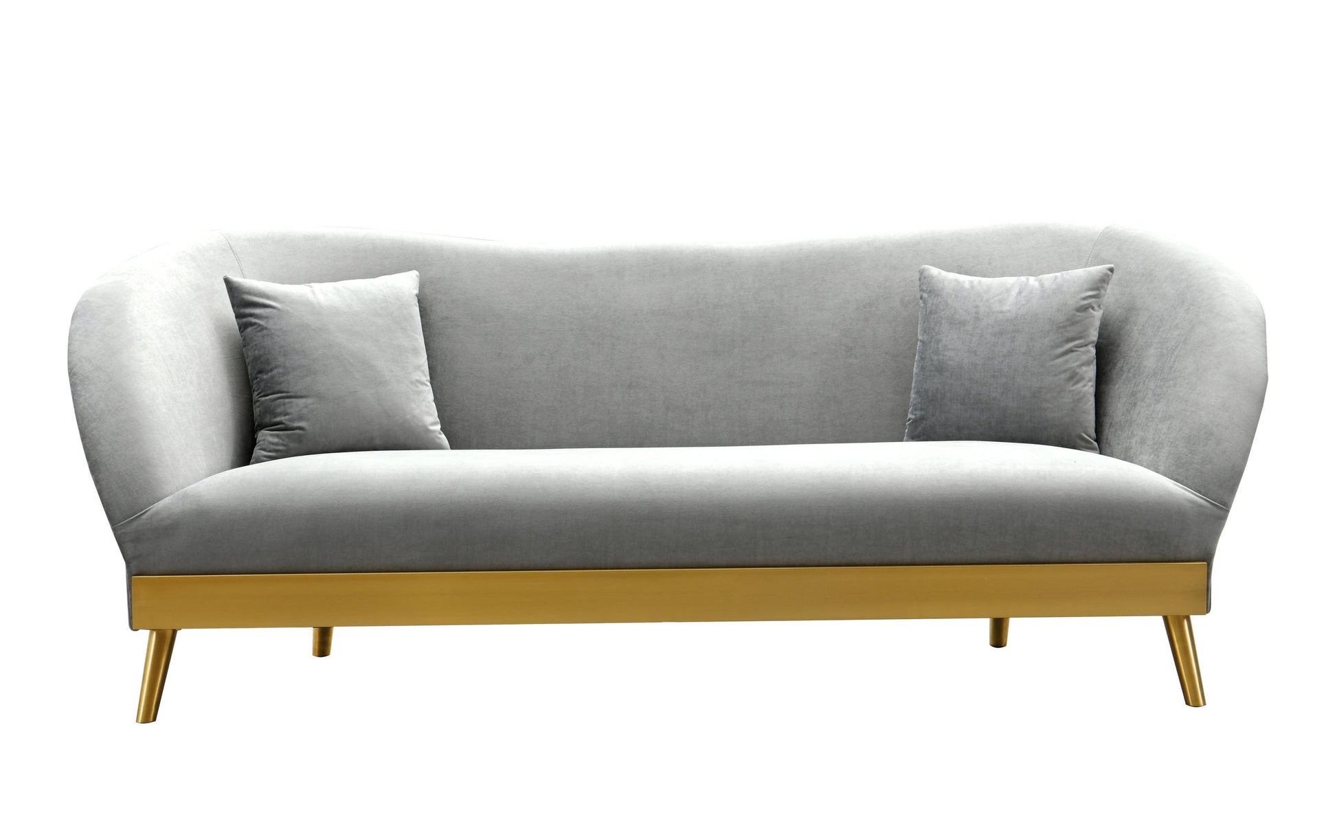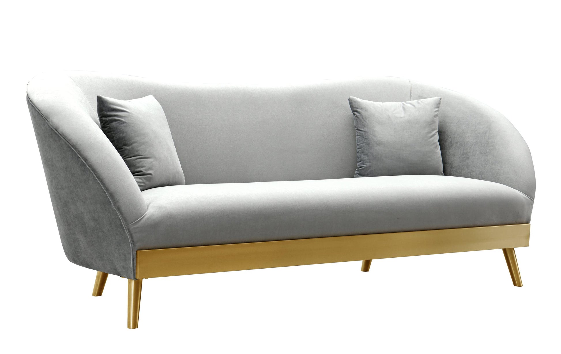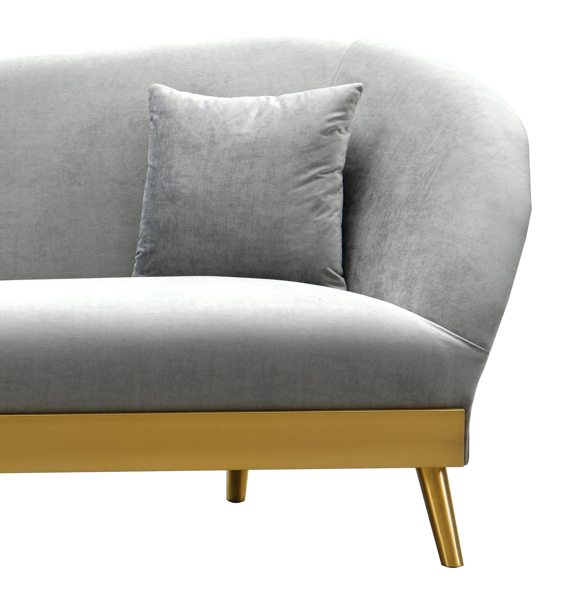 The Chloe sofa is the epitome of modern glamour. A curved silhouette with luxurious velvet on a brushed gold base will be sure to dazzle and blend with any decor. We know you'll love the versatility of this sofa, and its inviting coziness. Prop it against a bold wall color for a pop that speaks for itself. Matching pillows included. Available in multiple colors.
