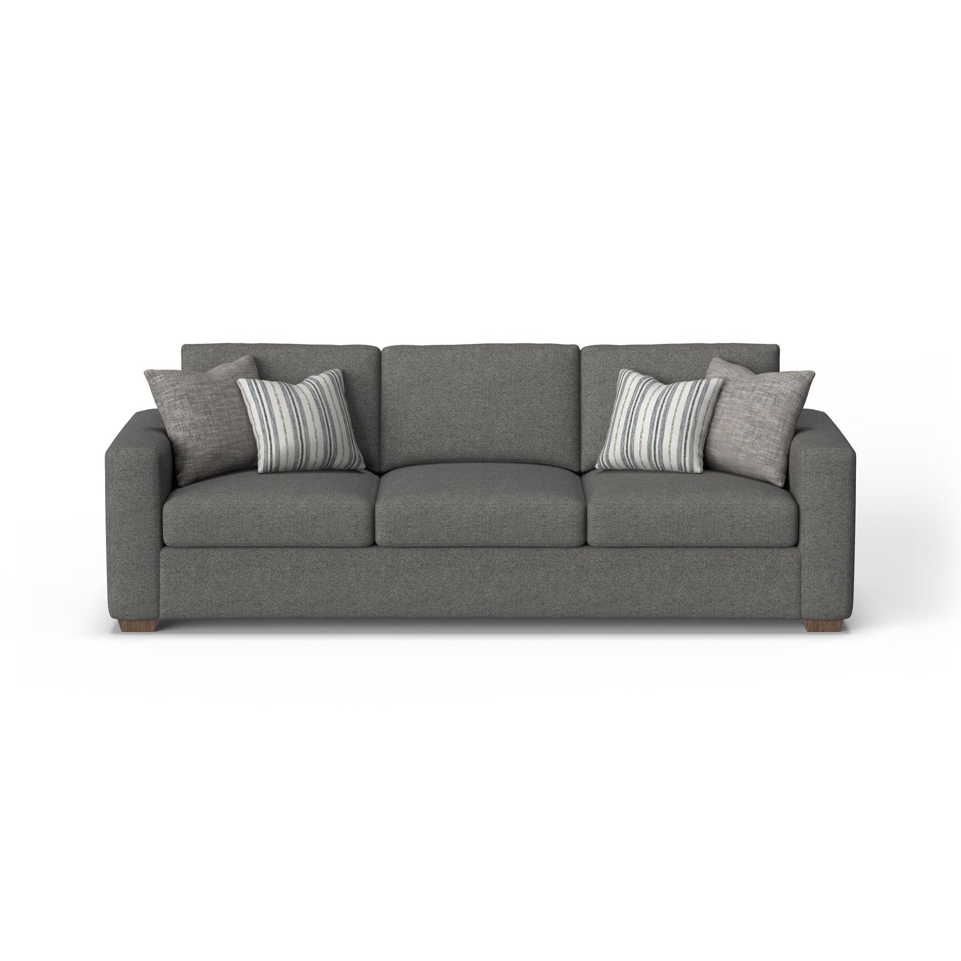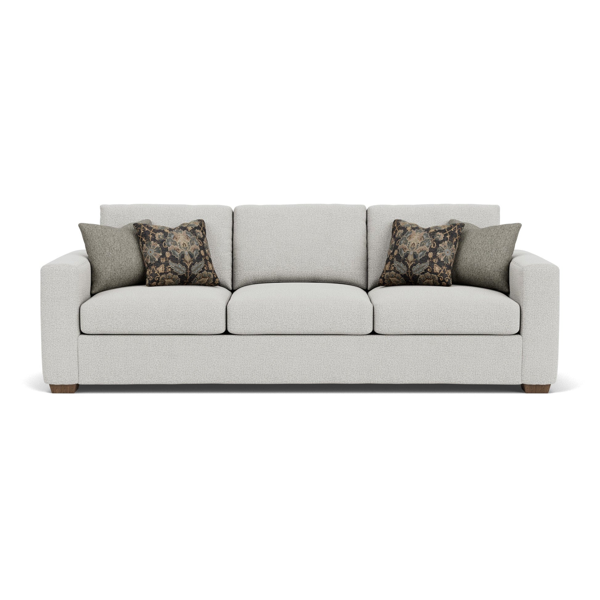 Stylish Simplicity Clean lines, extra-wide and ultra-comfy seats will make you want to lounge a little longer on our Collins sofa. Generous in scale to offer up plenty of room to relax, Collins is distinguished by large, lofty cushions and wide track arms that sit on bold block legs for a timeless, casual look that begs you to curl up and get comfortable. Offered in your choice of upholstery and finishes, this sofa can be customized to suit your personal style. Transitional style with wide track arms Bold block legs come in your choice of finish Removable and reversible seat cushions allow you to flip and rotate them for even wear Includes accent pillows in your choice of fabric to match your personal style The patented Blue Steel Spring in the seat provides unmatched support and lasting comfort Constructed with a durable five-layer wood frame with premium resistance to warping Upholstered in your choice of fabric, including those with performance and sustainability characteristics Handcrafted in North America Model Number: 7107-32 Dimensions 36H x 101W x 40L