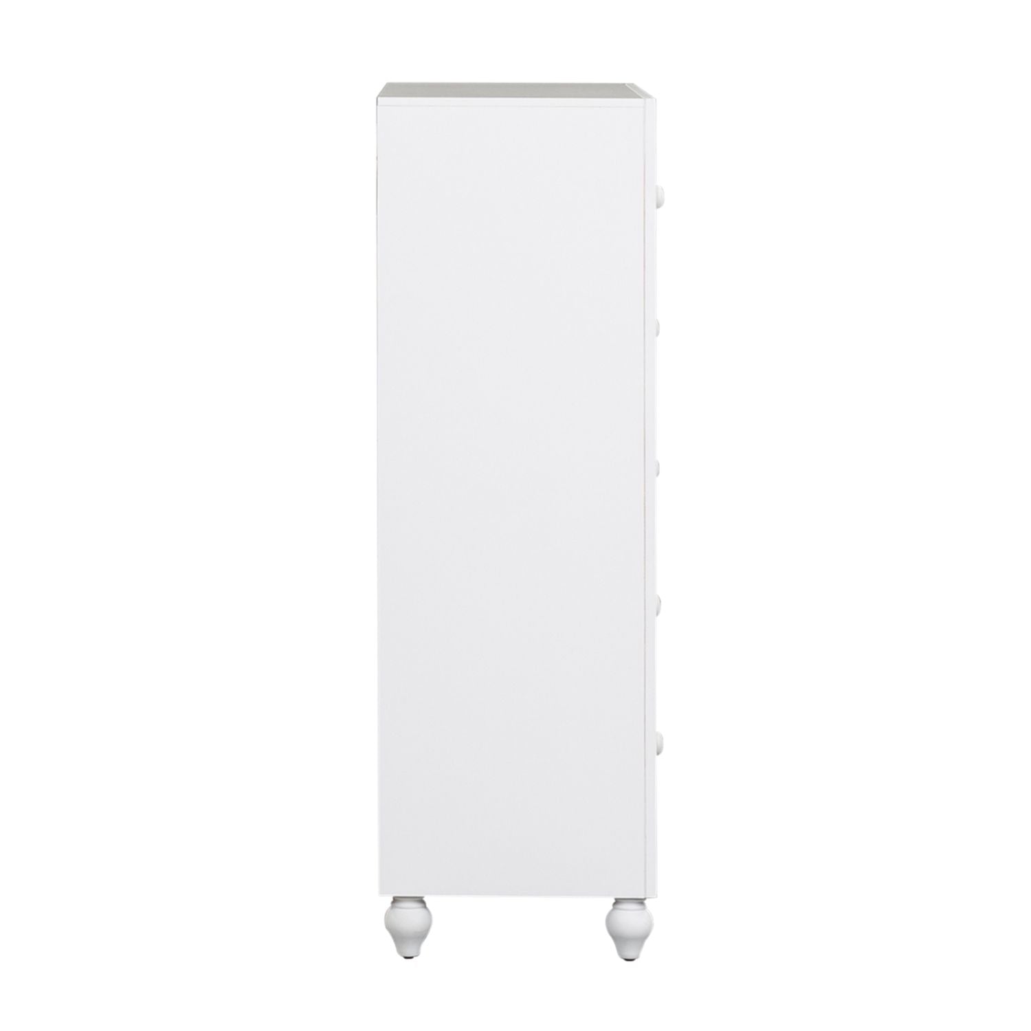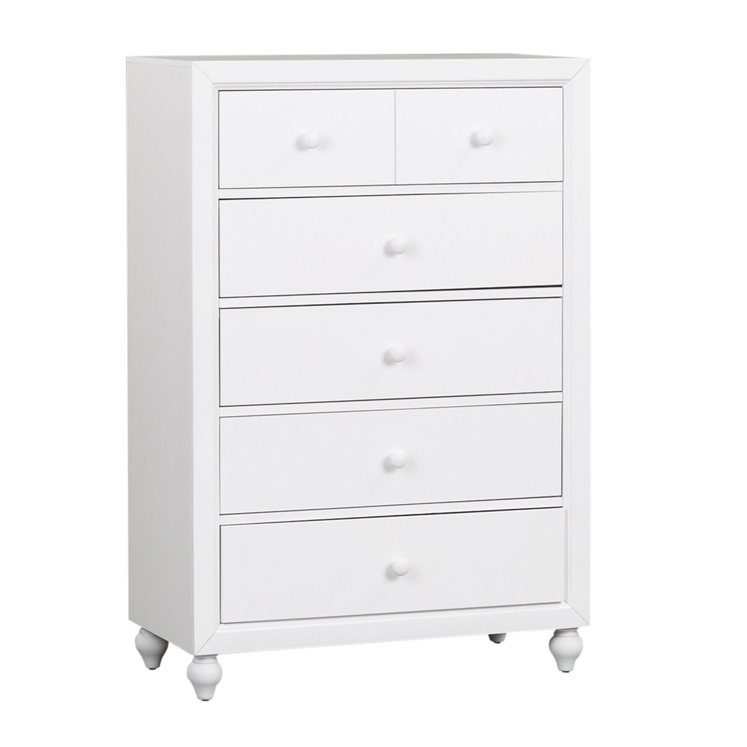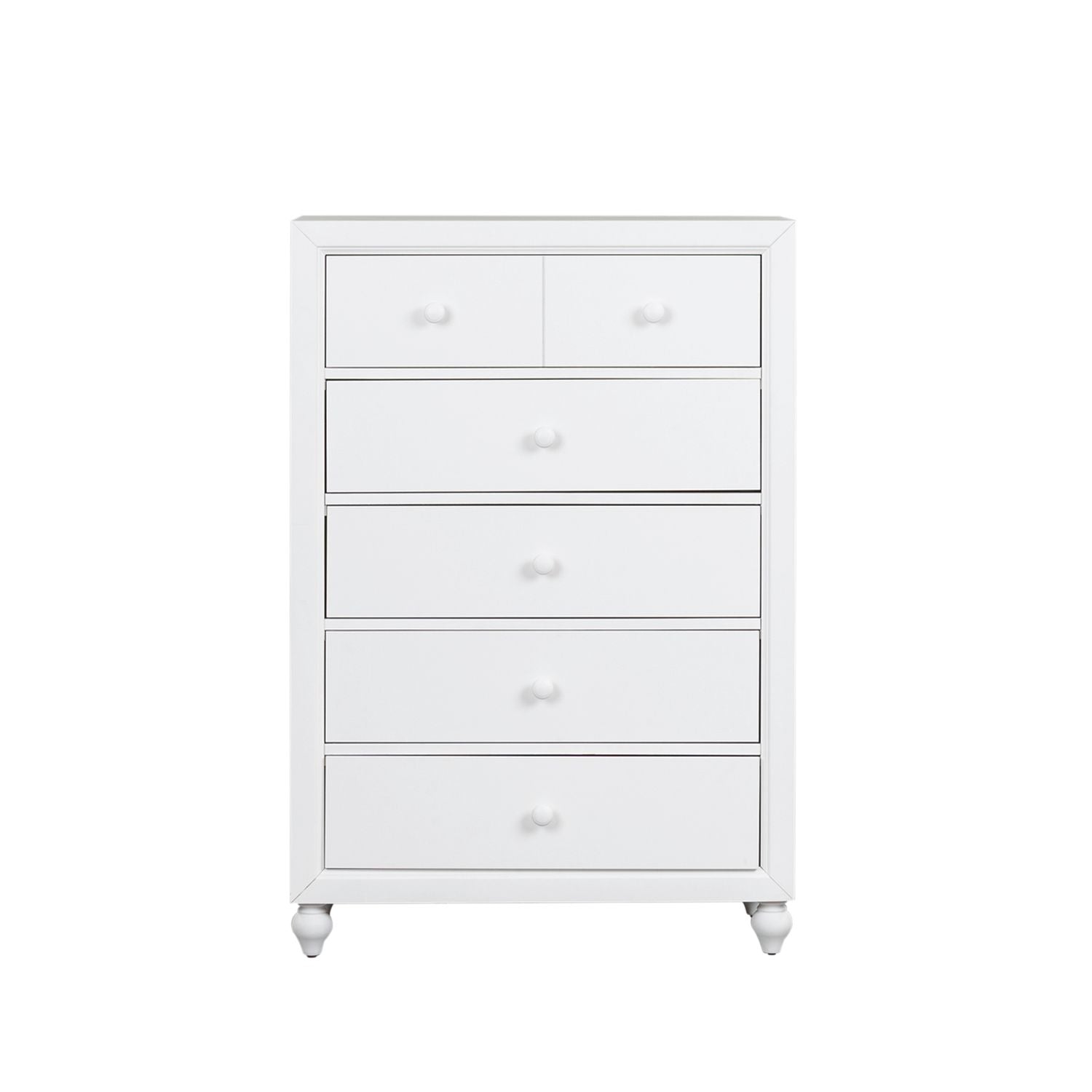 Indulge in cottage design with the Cottage View 5 drawer chest. Crafted by melamine and a rubberwood solid frame, this piece features a clean white finish, kenlin drawer glides, bottom case dust proofing, a laminate drawer interior, bluff cut top drawers, solid wood picture framed molding, bun feet, and is acented by wood knob hardware. This piece is available in an alternate finish and the melamine is scratch resistant, sure to make this piece last in any home.