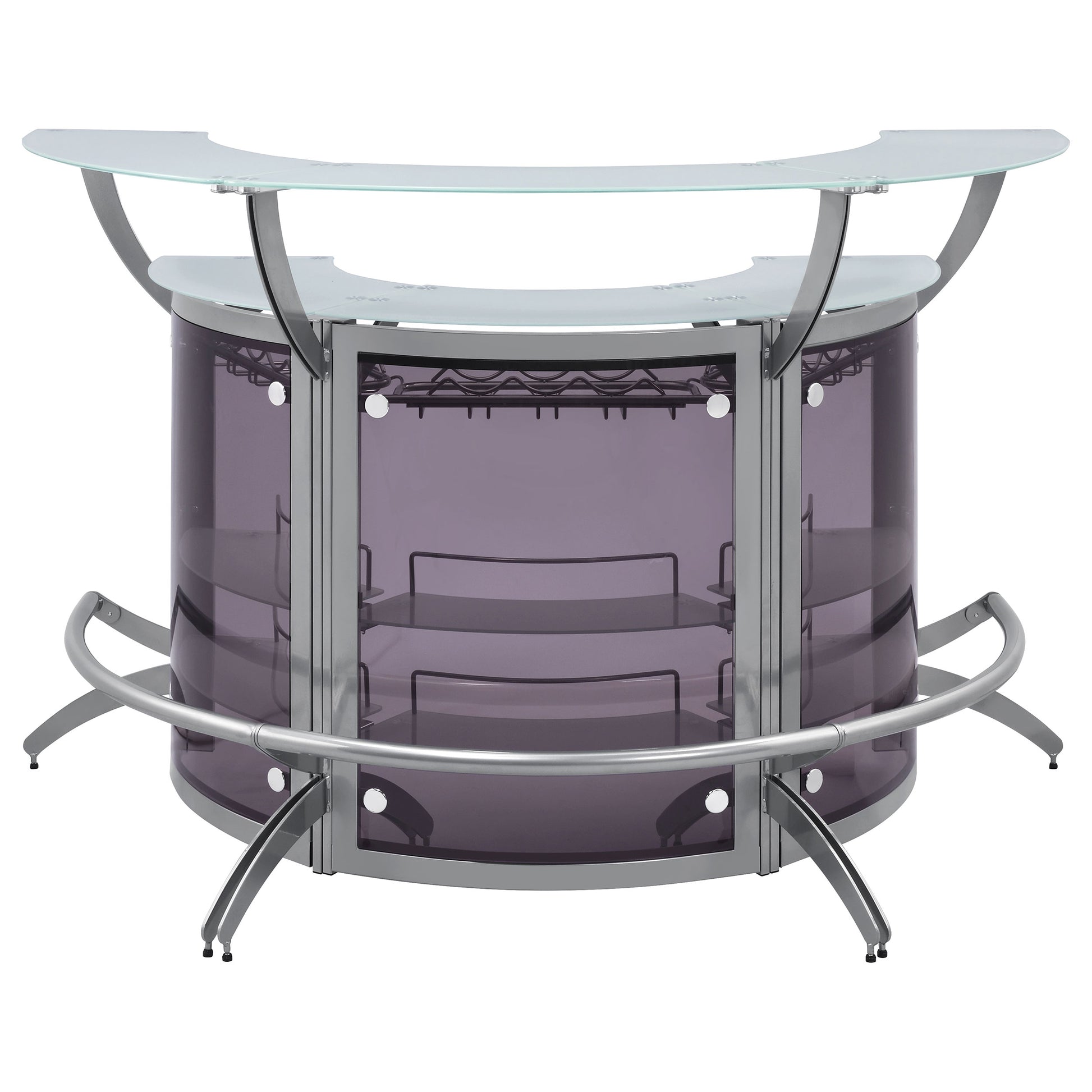 • Contemporary bar unit showcases a curved chic design with metal frame in a silver finish