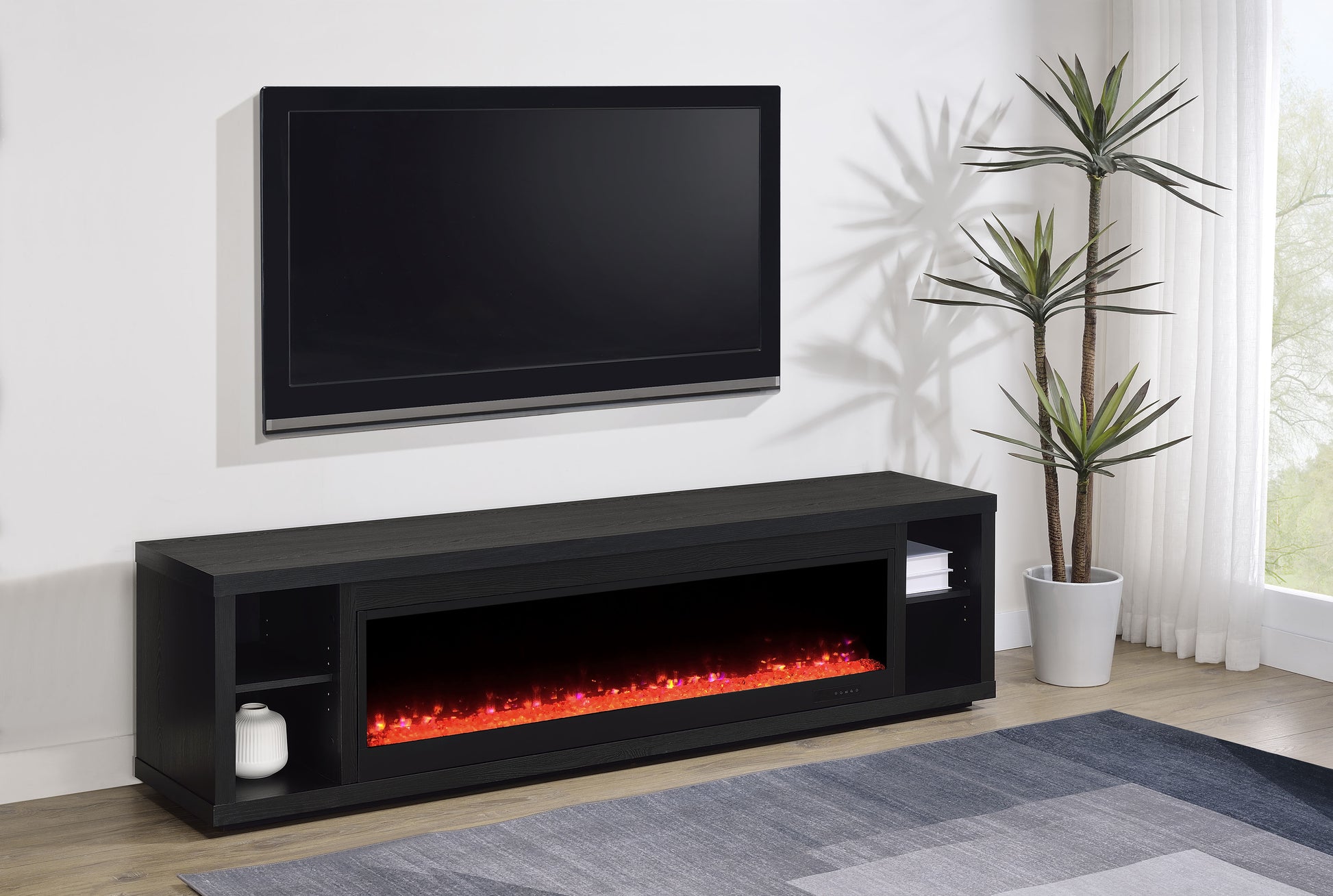 • TV stand fireplace console with flame visualizer and crushed acrylic crystals for visual warmth