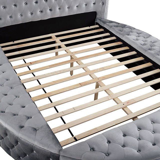 The unconventional circular shape of this highly glamorous bed is not the only surprise you can take with you into your master suite! The edges all around the bed have hidden compartments—one each side and one on the footboard. Soft to the touch, the whole bed is upholstered in velvet-like fabric tufted with buttons. And the headboard stylishly curves along with the circular frame of the bed, with nailhead trim and rolled details reminiscent of the classic chesterfield design.