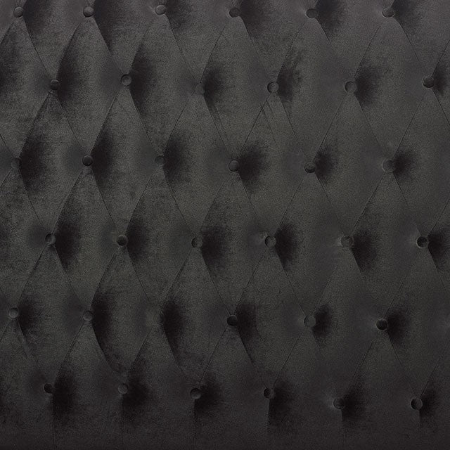 The unconventional circular shape of this highly glamorous bed is not the only surprise you can take with you into your master suite! The edges all around the bed have hidden compartments—one each side and one on the footboard. Soft to the touch, the whole bed is upholstered in velvet-like fabric tufted with buttons. And the headboard stylishly curves along with the circular frame of the bed, with nailhead trim and rolled details reminiscent of the classic chesterfield design.