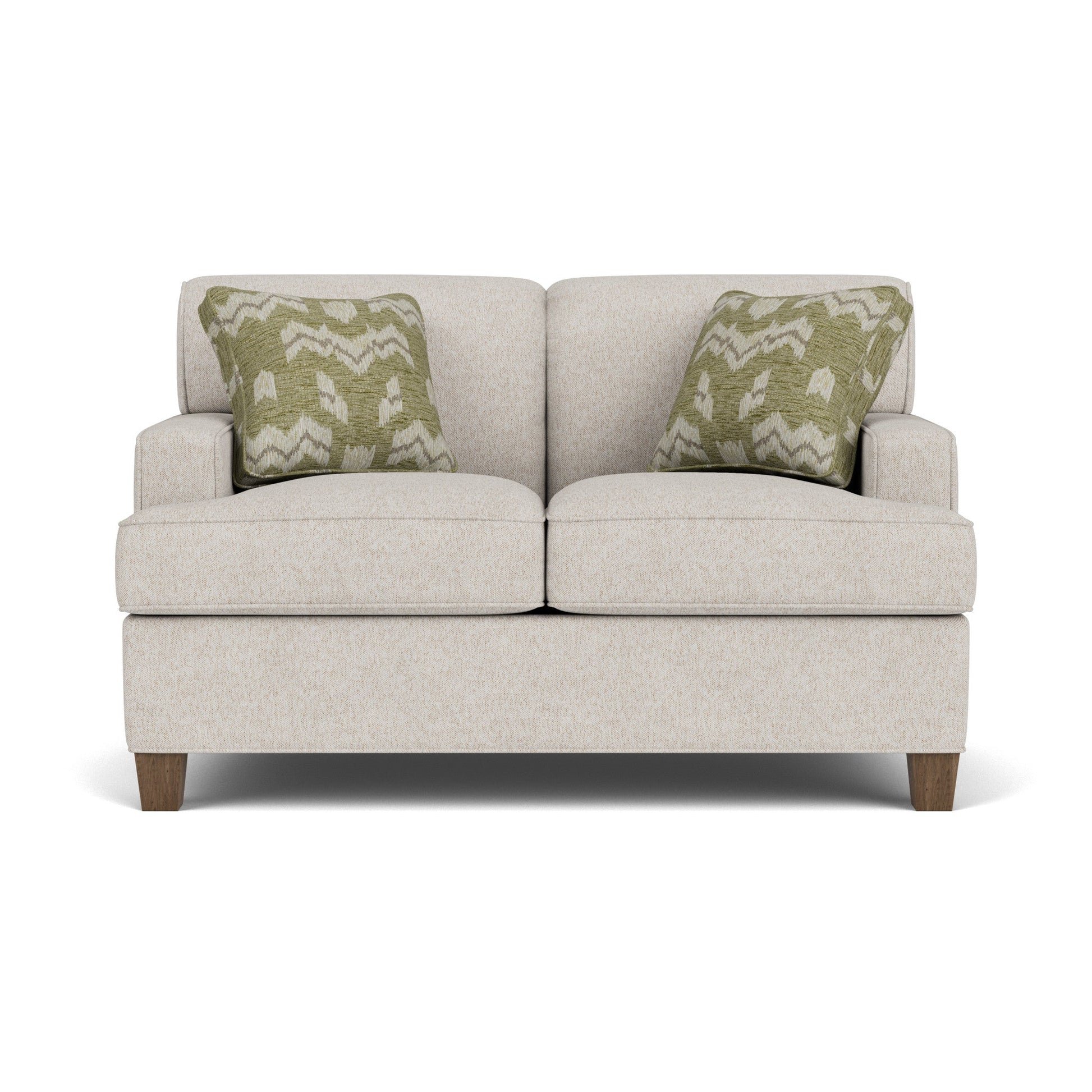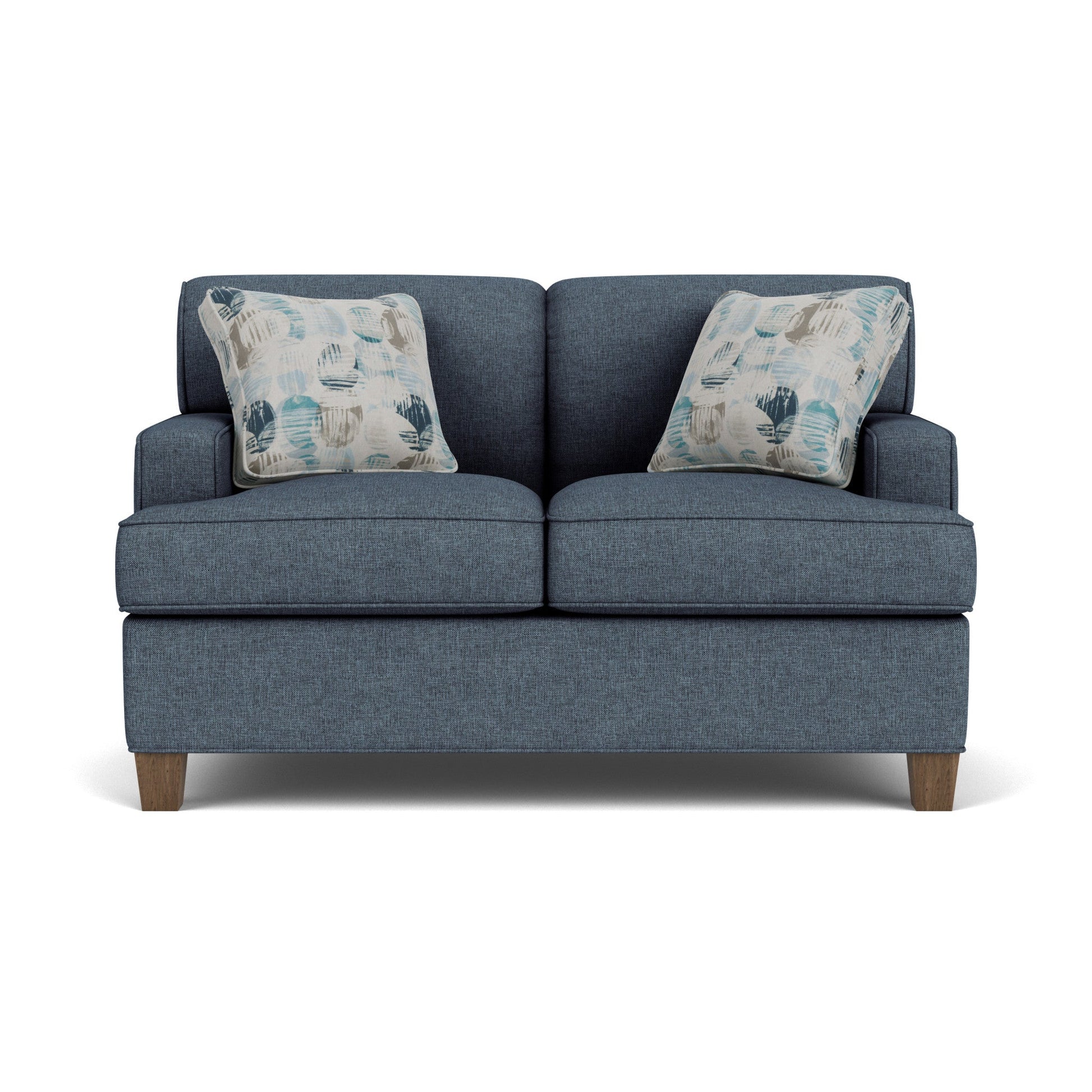 Hearty and Inviting Indulge in the embrace of timeless elegance with the Dempsey loveseat, a testament to both comfort and style. This plush and curvy tight back frame is balanced with square arms, clean lines and a welt cording detail for a touch of refinement. Customize Dempsey with fabric and wood finish options to elevate your living space and immerse yourself in unmatched comfort. Transitional style with clean track arms and a welt-trim detail Tight back design is robustly filled for plush comfort Includes two accent pillows in your choice of fabric to match your personal style High resiliency seat cushions are engineered to maintain their shape over time and are removable and reversible The patented Blue Steel Spring™ seat system provides unmatched support and lasting comfort Square tapered legs are available in three finish options Durable wood frame for lasting performance Upholstered in your choice of fabric, including those with performance and sustainability characteristics Handcrafted in North America Model Number: 5641-20 Dimensions 35H x 56W x 37L