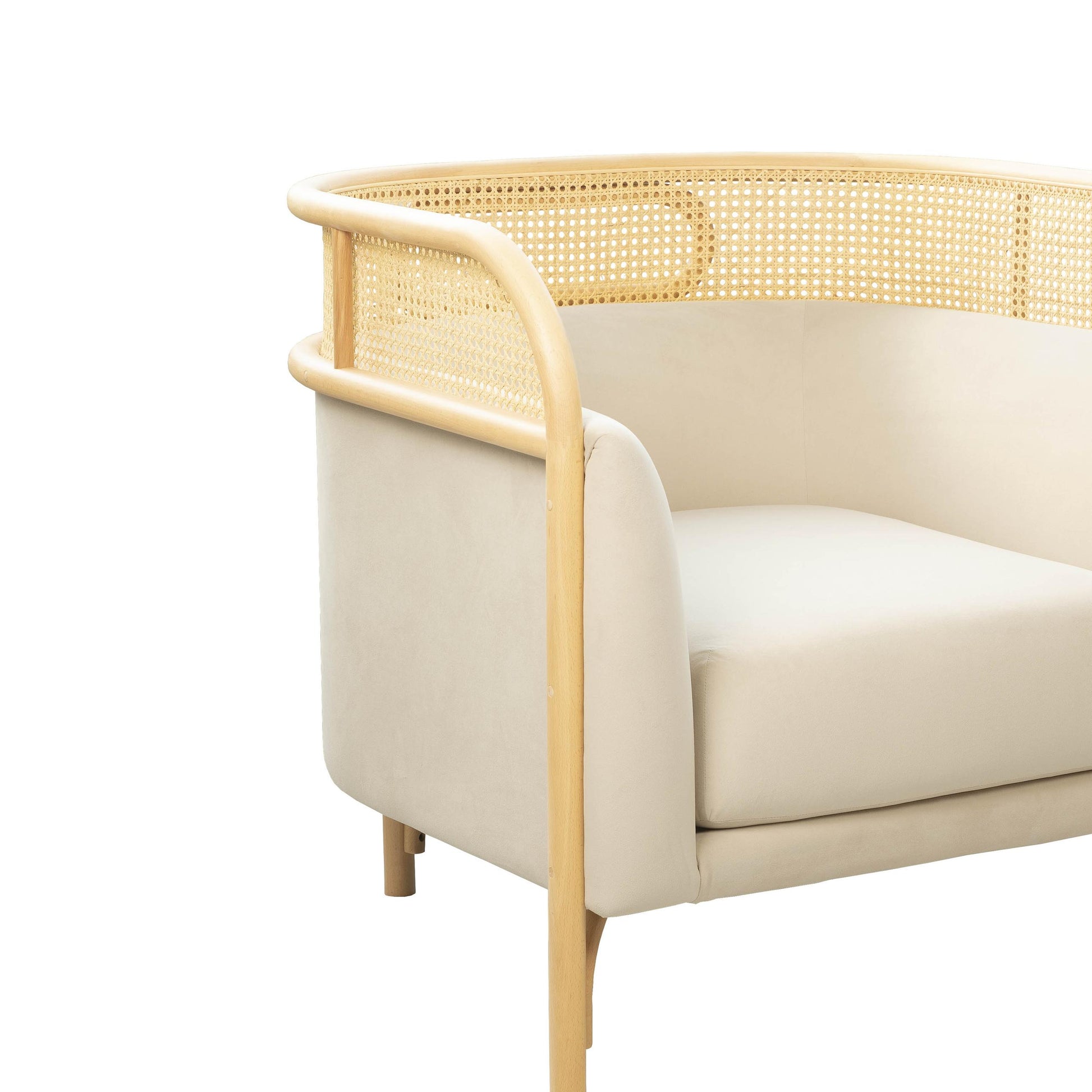 The Desiree Collection presents itself with a captivating air of elegance and charm. The Desiree accent chair is upholstered in a beautiful velvet fabric, accented by intricate rattan details, and supported by sturdy solid beech wood legs. The eclectic mix of textures and its whimsical style will ensure sunny vibes and year-round spring feels in your home. Pair it with the matching loveseat and ottoman for a stunning living room set!