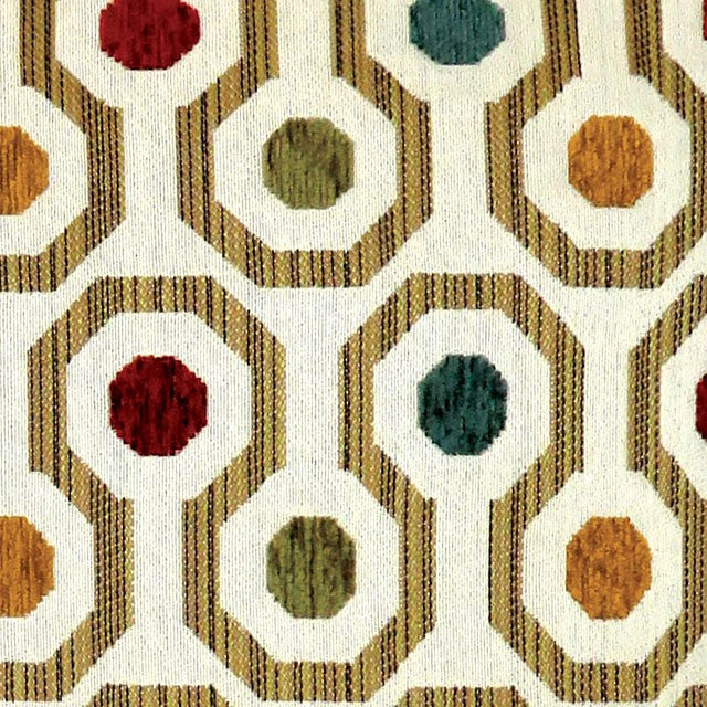 Small, colorful dots are organized in a symmetric, frieze-like pattern. Try this pillow if you want to bring a lighter mood to your space.