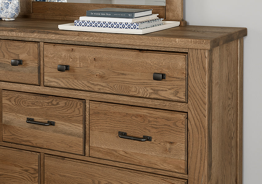 Add versatile and stylish storage to your bedroom with this seven drawer dresser. Six drawers of varying sizes offer up plenty of space for you to store any number of your favorite clothes. The solid oak construction of this piece allows you to rest easy knowing that this durable dresser will last for years to come.