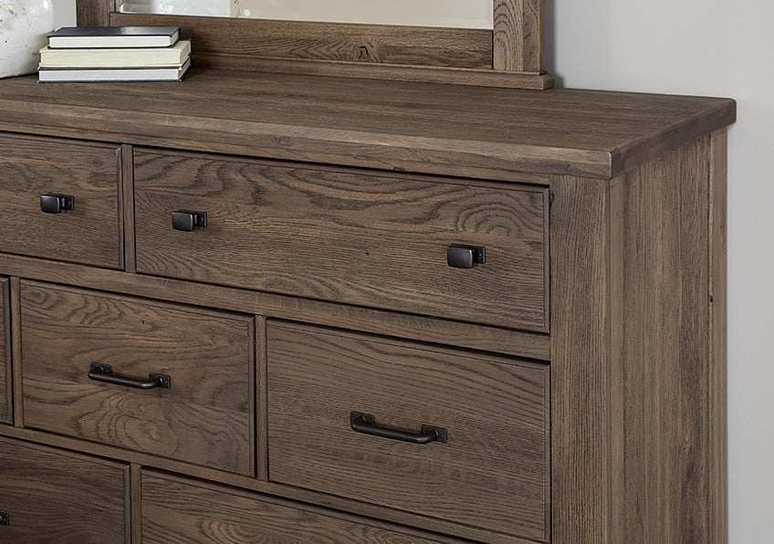 Add versatile and stylish storage to your bedroom with this seven drawer dresser. Six drawers of varying sizes offer up plenty of space for you to store any number of your favorite clothes. The solid oak construction of this piece allows you to rest easy knowing that this durable dresser will last for years to come.