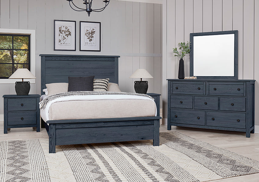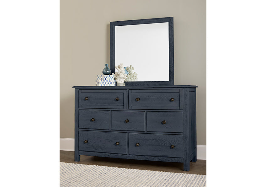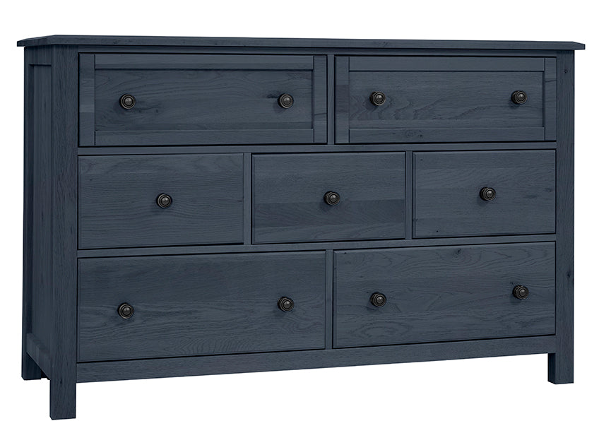 Made in the USA; this dresser shown in indigo finish has seven drawers and is made from solid American White Oak. Its design elements create a look that fits farmhouse; loft; cottage; and coastal spaces. Available in 5 quick ship finishes.