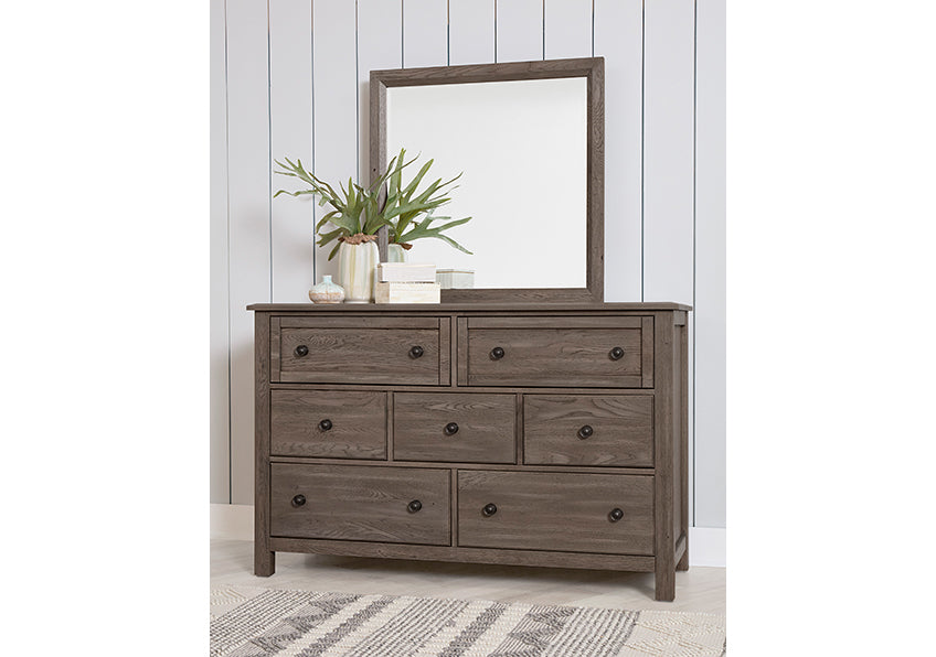Made in the USA; this dresser shown in driftwood grey finish has seven drawers and is made from solid American White Oak. Its design elements create a look that fits farmhouse; loft; cottage; and coastal spaces. Available in 5 quick ship finishes.