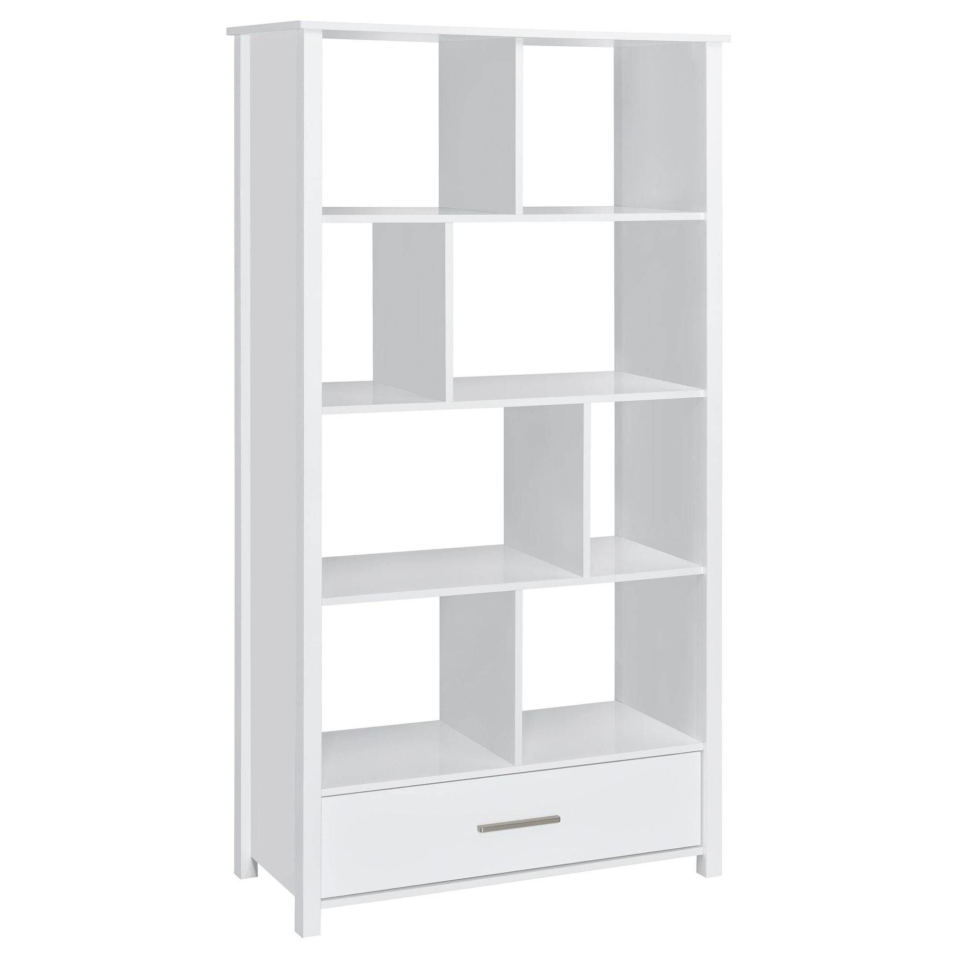 • Contemporary bookshelf with asymmetrical cubed layout and one storage drawer