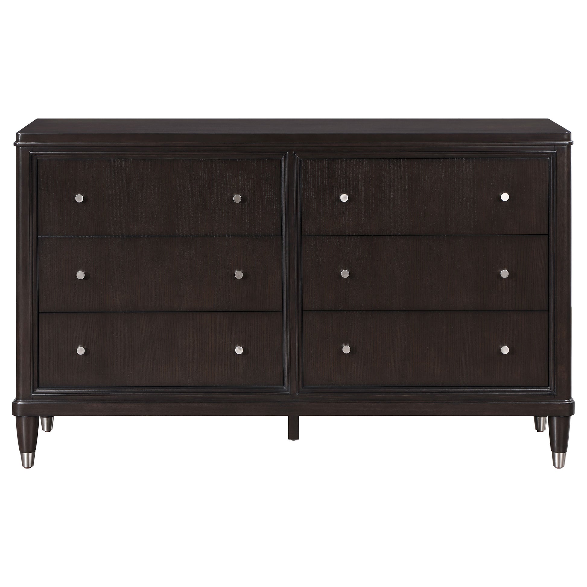 • A contemporary six-drawer dresser offers stylish clothing and accessory storage and a refined look