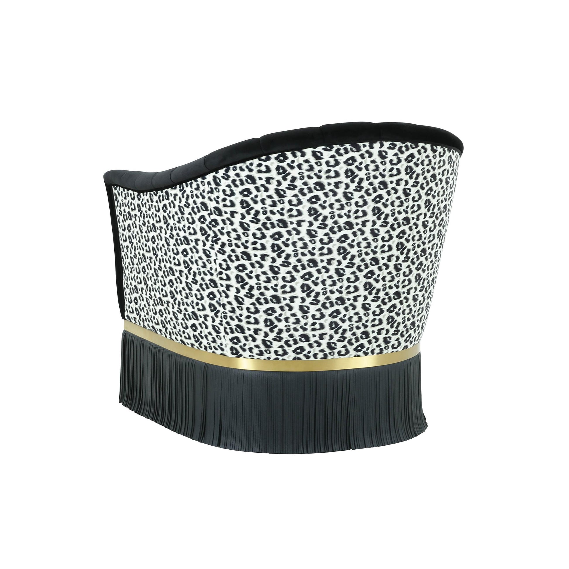 Add a dash of pizzazz and excitement to your space with the Enid Chair. Upholstered in sumptuous velvet while boasting a leopard print on the outer body, this chair is like no other. The fringe-lined gold base adds a flare of coolness to this comfortable chair.
