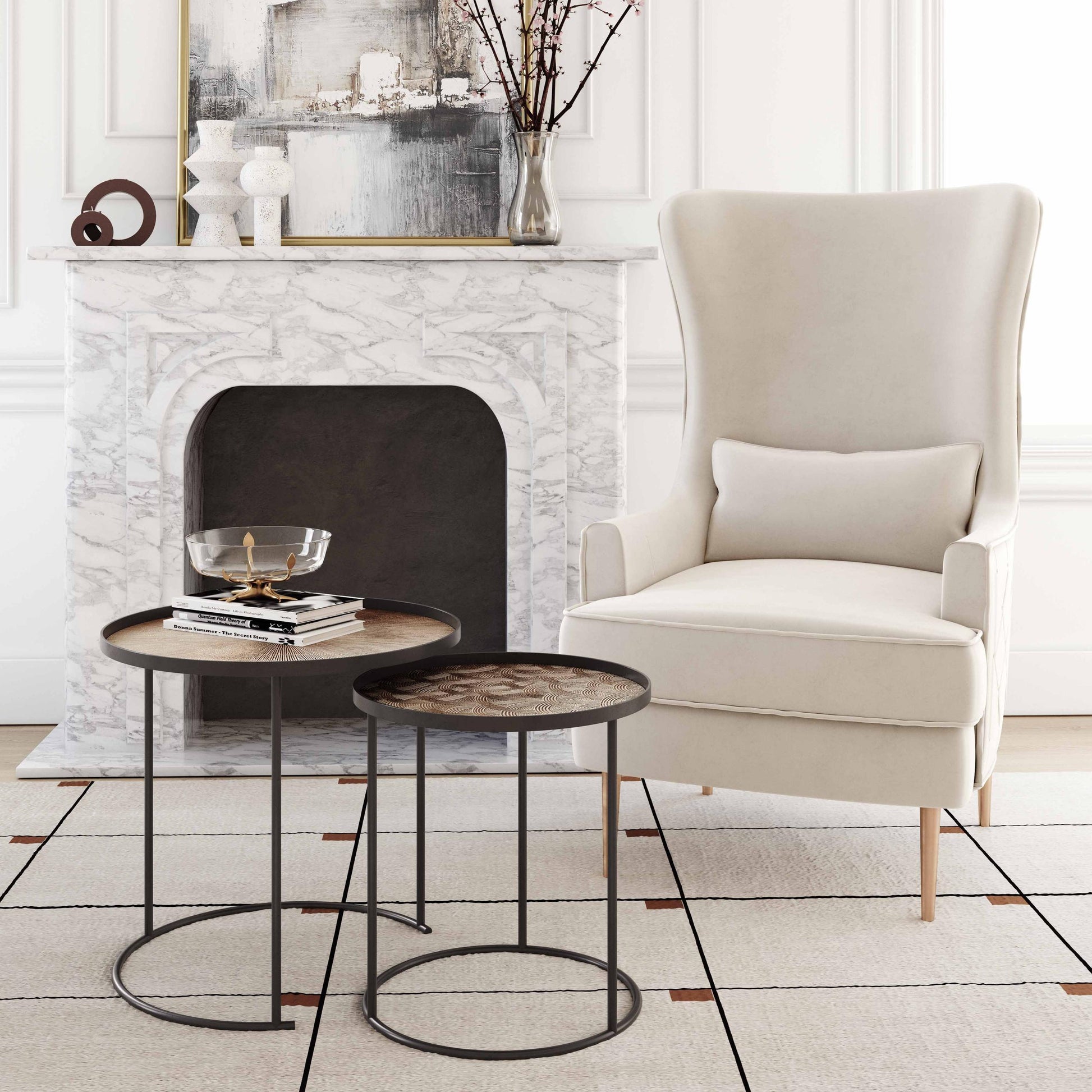 Introducing the Eve Nesting Tables from the Inspire Me! Home Decor X TOV collection! This pair of accent tables features matte black bases, with intricate hand-crafted designed tabletops that's perfect for holding your favorite cocktail, book or decorative piece.