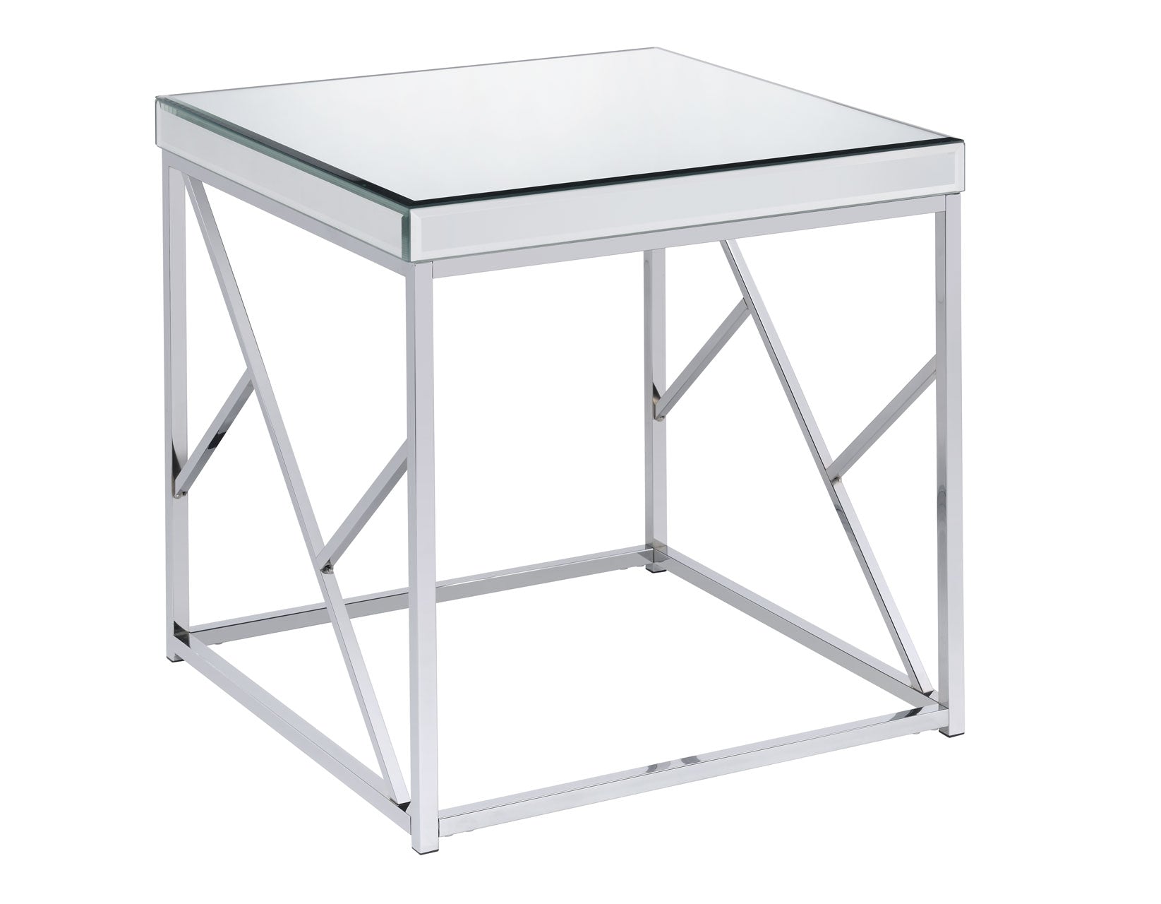 The Evelyn set offers modern elegance with its geometric base design and boxed mirrored top. You will enjoy how the light bounces off the table top and apron Rail to create a larger more vibrant space. The mirrored table also features a sturdy iron base that is finished with a sparkling chrome.