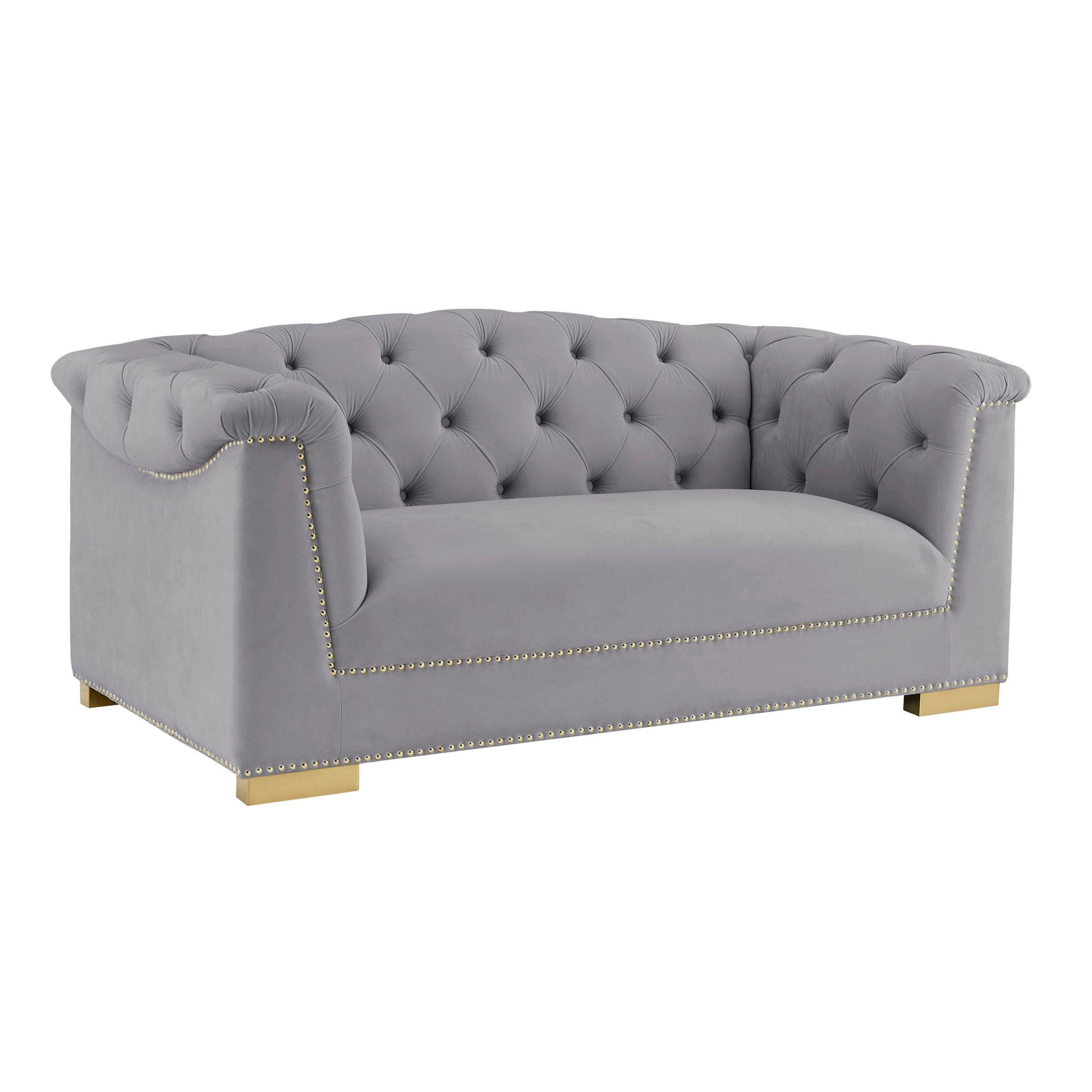 Offering a fresh and modern spin to a classic style, Inspire Me Home Decor and TOV proudly introduce the Farah loveseat. With its luscious velvet upholstery, unique tufted design on its rolled arms and hand-applied gold nailhead trim, it will be the focal point of your living space. Available in several neutral color options to meet your home styling needs.
