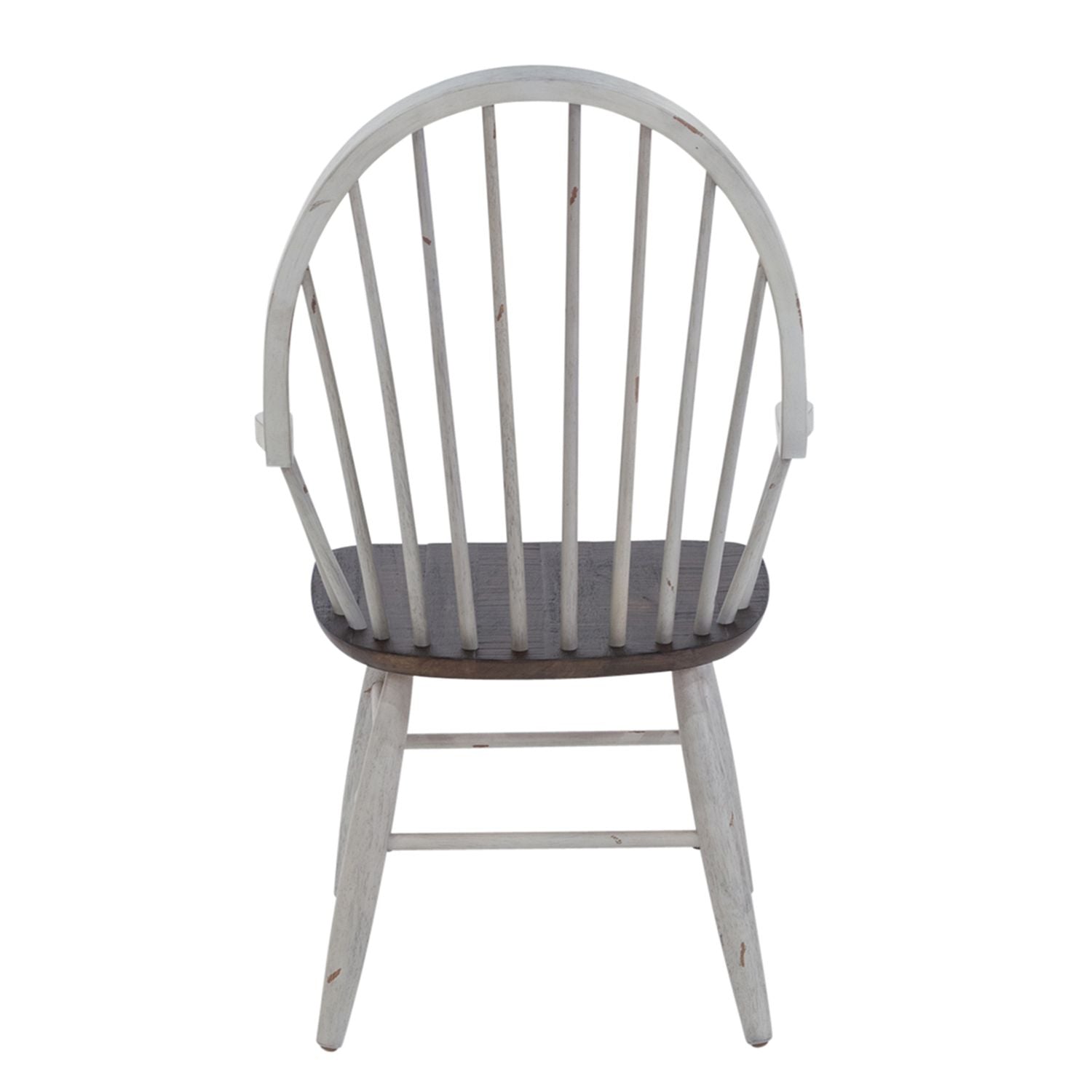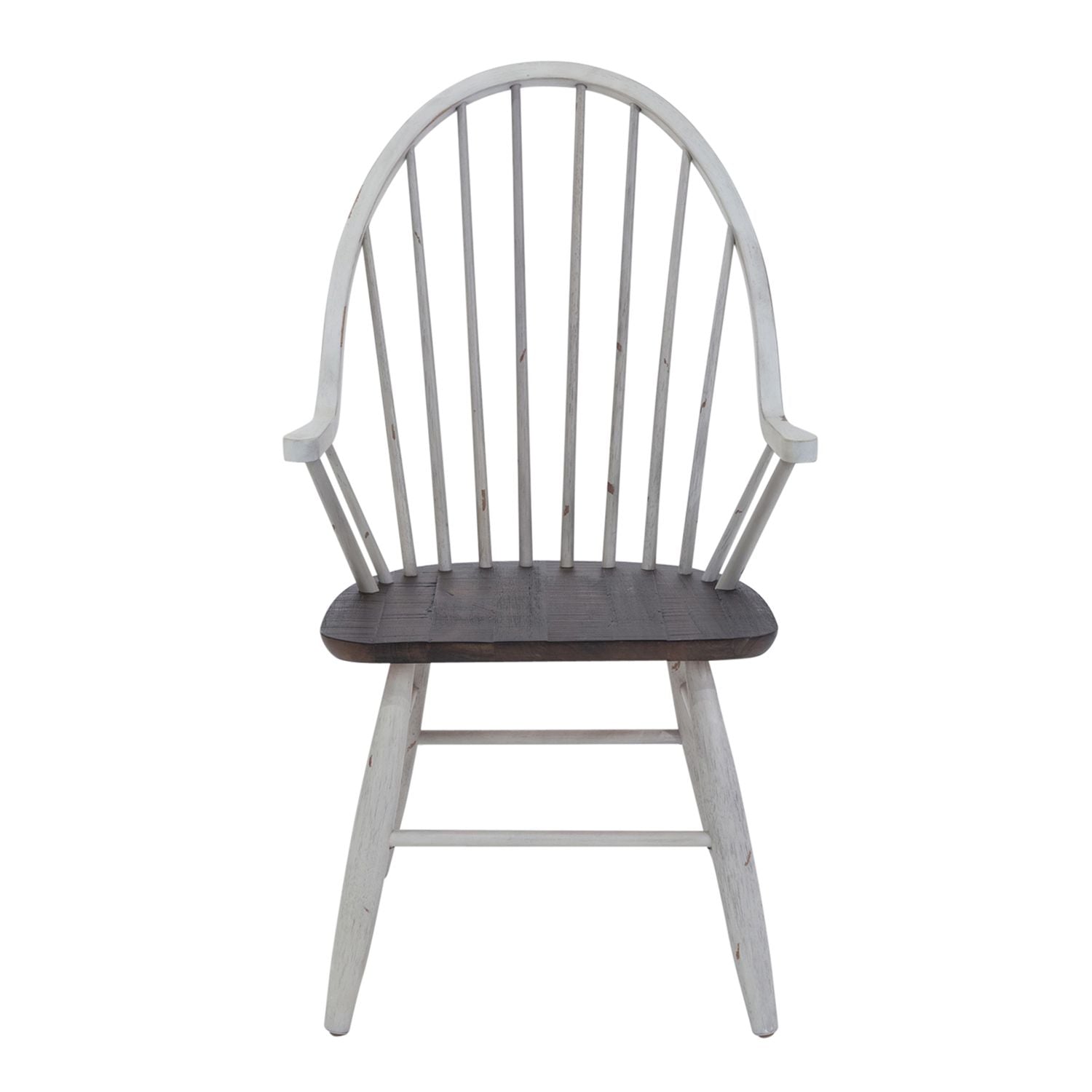 Sit in style and comfort with the Farmhouse Windsor back arm chair. Crafted of rubberwood solids, this piece features a timeless heavy distressing and nylon chair glides to protect your flooring, a saddle shaped seat for extra comfort, an arched spindle back for support, and is anchored by round turned splayed legs. The two-tone white finish with wood tone seat creates a versatile look that is sure to be the perfect addition to any space.