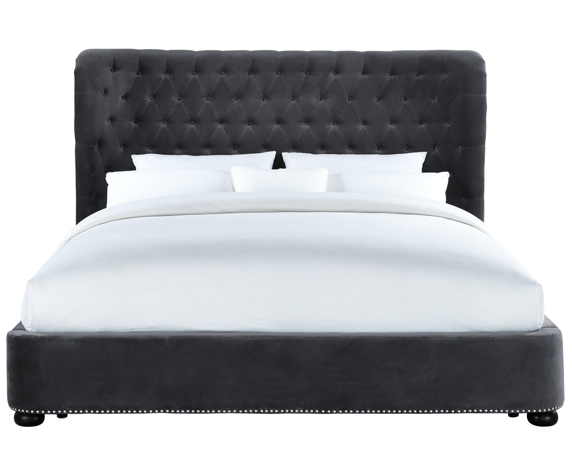 This elegant and contemporary Finley platform bed features a sculpted headboard with gentle contours on the side. This bed is a true masterpiece and boasts over 1,500 hand-applied nail heads and a solid wood frame. Available in queen or king sizes. No box spring is required and slats are included.