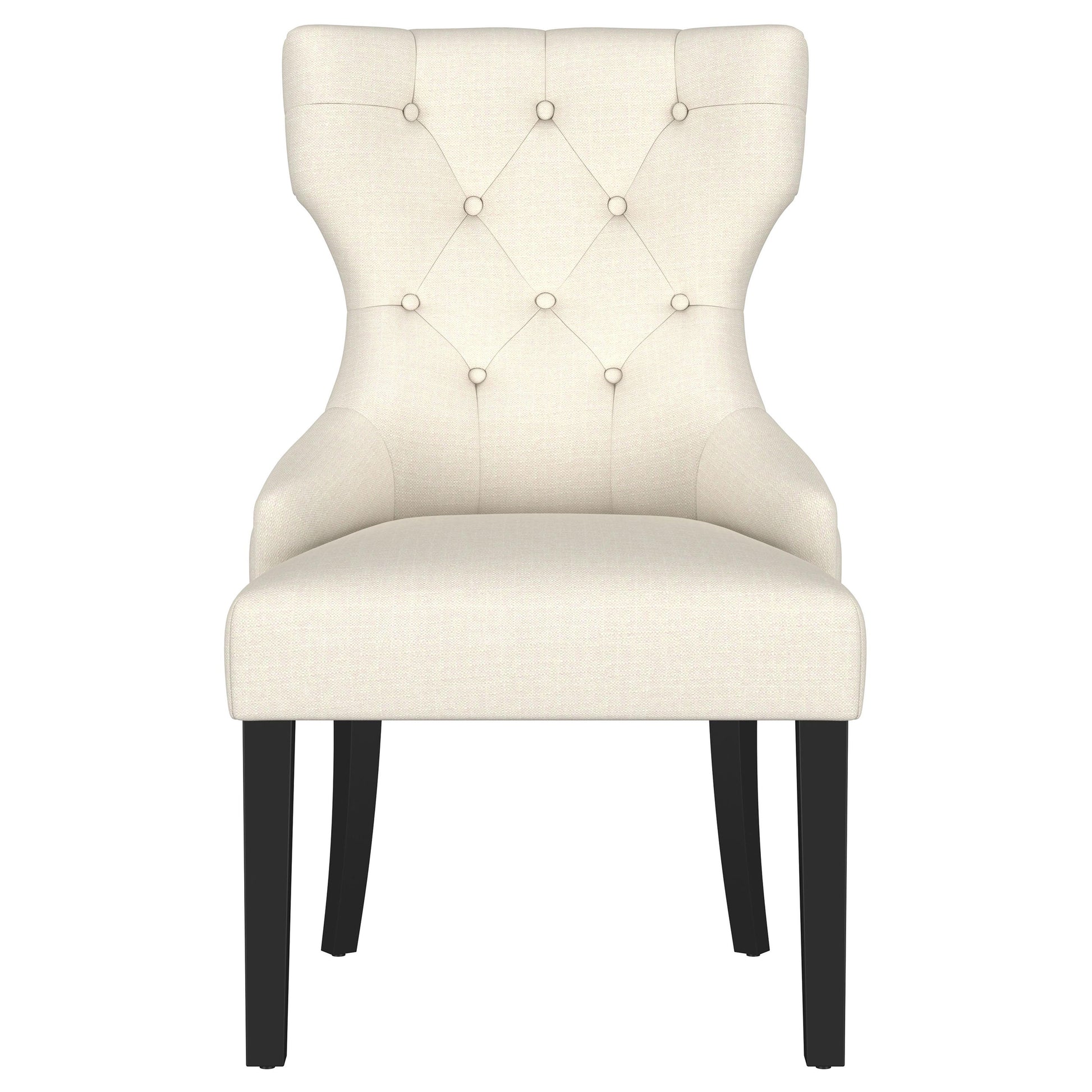 • Upholstered tufted dining chairs with a classic wingback silhouette provide both comfort and style