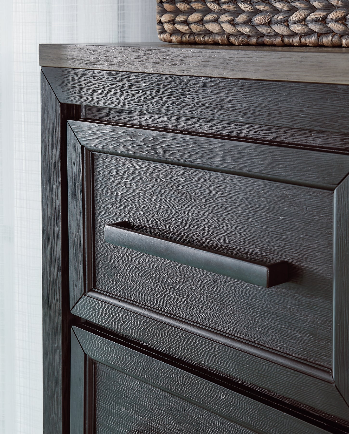 | Details | Made with hardwood solids, select oak veneers and engineered wood, Two-tone finish (brushed black and dusty grayish brown wood tone), Sleek drawer pulls with black finish, 11 soft-close, smooth-gliding drawers with fully finished interiors and dovetail construction (top drawers felt lined), 5 drawers with brushed black finish; 6 drawers with grayish brown wood tone, 3 drawers located behind each door | |