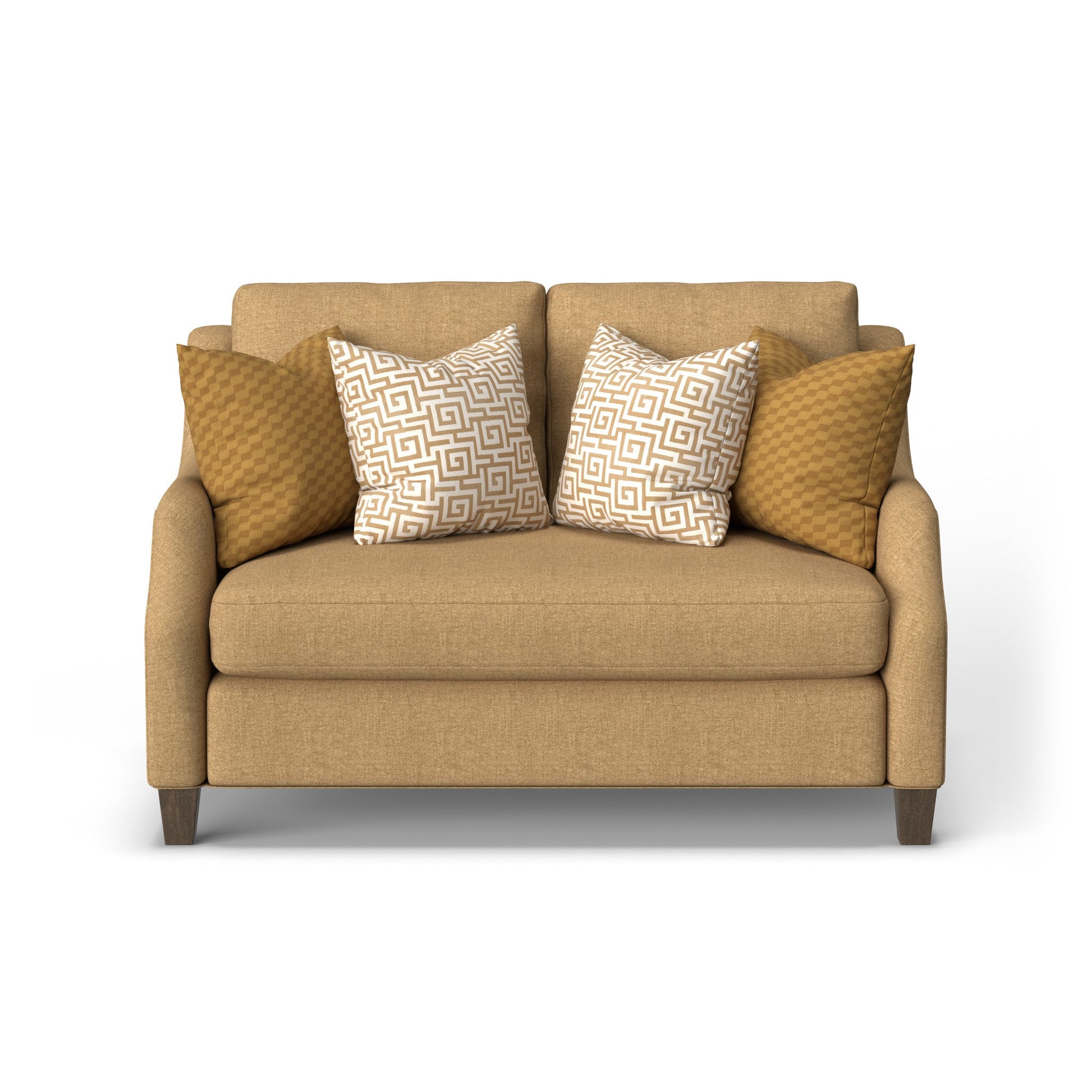 Vintage-Inspired Elegance A true heirloom loveseat, Gianna is vintage-inspired elegance to last a lifetime. This bench loveseat sports luxurious English arms with a welt trim for added glamour. Vintage style meets modern innovation with removable, high-density cushions, easy to clean and built to last with our patented Blue Steel Spring ™ seat system. Available in high-performance upholstery options to stand up to daily wear, the Gianna is a timeless piece built to last a lifetime. With square tapered legs available in three gorgeous finish options, this loveseat is perfect for those looking to make a statement. Elegant English arms with a welt-trim Square-tapered legs, available in three finish options Includes four accent pillows in your choice of fabric to match your personal style Built to last with Flexsteel’s Blue Steel Spring™ seat system providing unmatched support and durability Removable, high-density foam core bench seat cushion, engineered to maintain its shape over time, complete with a layer of recovery foam for everlasting quality and luxurious comfort Loose, welt-trimmed box back cushions can be rotated and sit on a pillow ledge to prevent them from falling behind the seat cushion Sustainably sourced, kiln-dried wood frame with mortise and tenon joinery for lasting strength Upholstered in the expertly tailored fabric of your choice, including high-performance and sustainable options Handcrafted in North America Model Number: 7823-201 Dimensions 40H x 60W x 40L