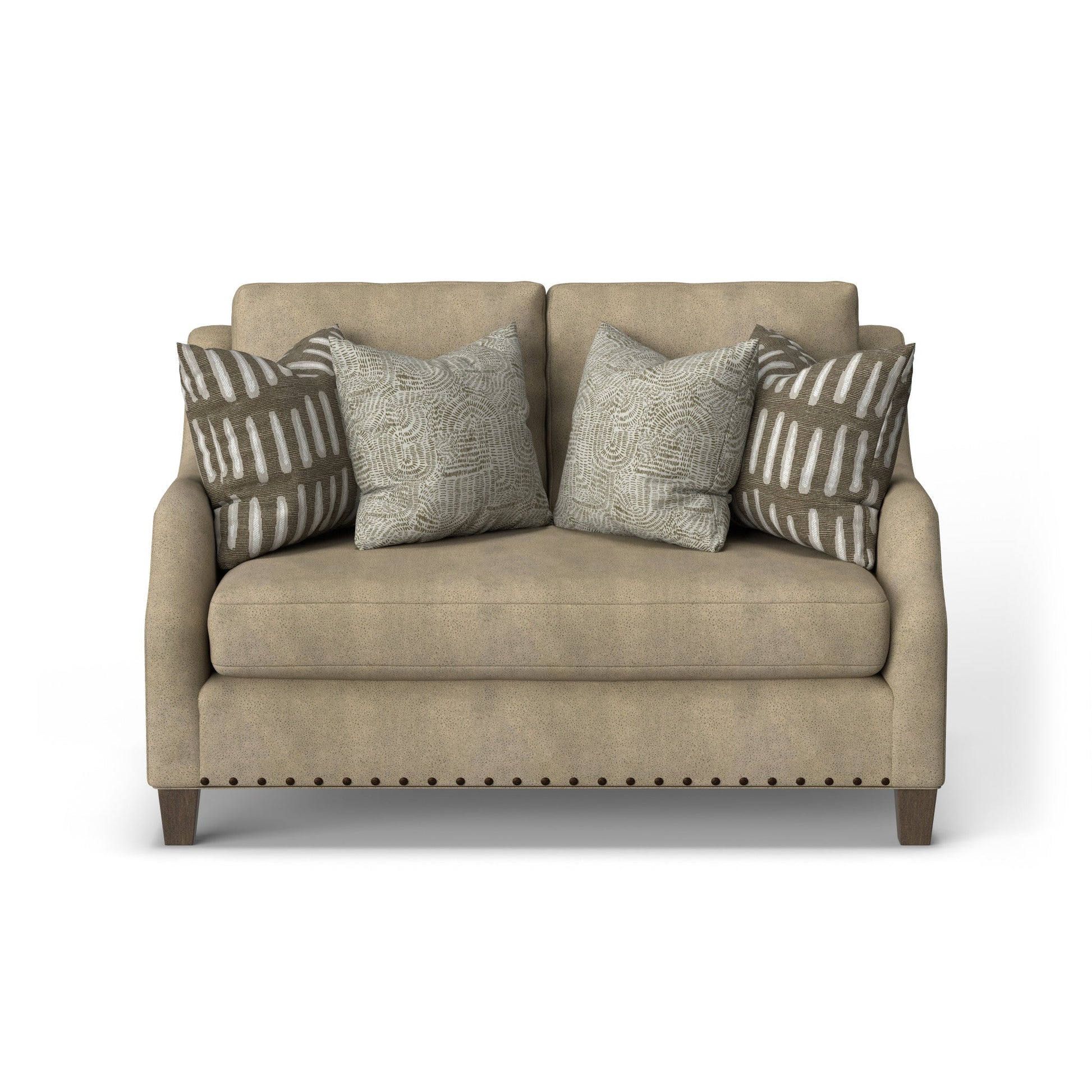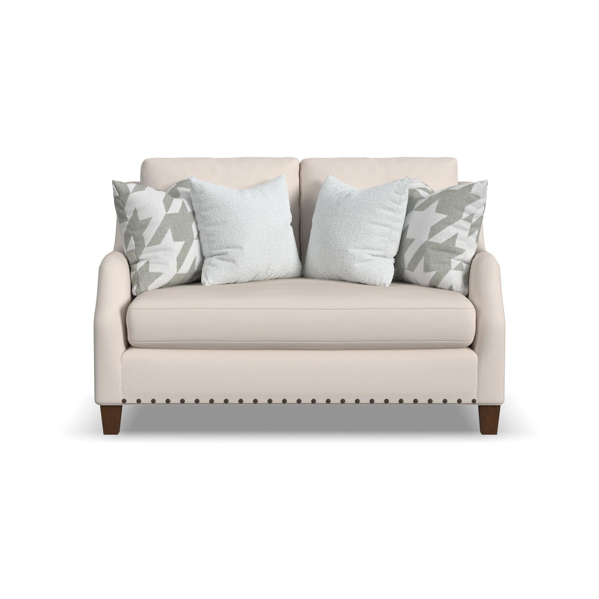 Vintage-Inspired Elegance A true heirloom loveseat, Gianna is vintage-inspired elegance to last a lifetime. This bench loveseat sports luxurious English arms with a welt trim for added glamour. Vintage style meets modern innovation with removable, high-density cushions, easy to clean and built to last with our patented Blue Steel Spring ™ seat system. Available in high-performance upholstery options to stand up to daily wear, the Gianna is a timeless piece built to last a lifetime. With a gleaming nailhead trim available in four finish options, this loveseat is perfect for those looking to make a statement. Elegant English arms with a welt-trim Nailhead trim on the front rail, available in four finish options Square-tapered legs, available in three finish options Includes four accent pillows in your choice of fabric to match your personal style Built to last with Flexsteel’s Blue Steel Spring™ seat system providing unmatched support and durability Removable, high-density foam core bench seat cushion, engineered to maintain its shape over time, complete with a layer of recovery foam for everlasting quality and luxurious comfort Loose, welt-trimmed box back cushions can be rotated and sit on a pillow ledge to prevent them from falling behind the seat cushion Sustainably sourced, kiln-dried wood frame with mortise and tenon joinery for lasting strength Upholstered in the expertly tailored fabric of your choice, including high-performance and sustainable options Handcrafted in North America Model Number: 7824-201 Dimensions 40H x 60W x 40L