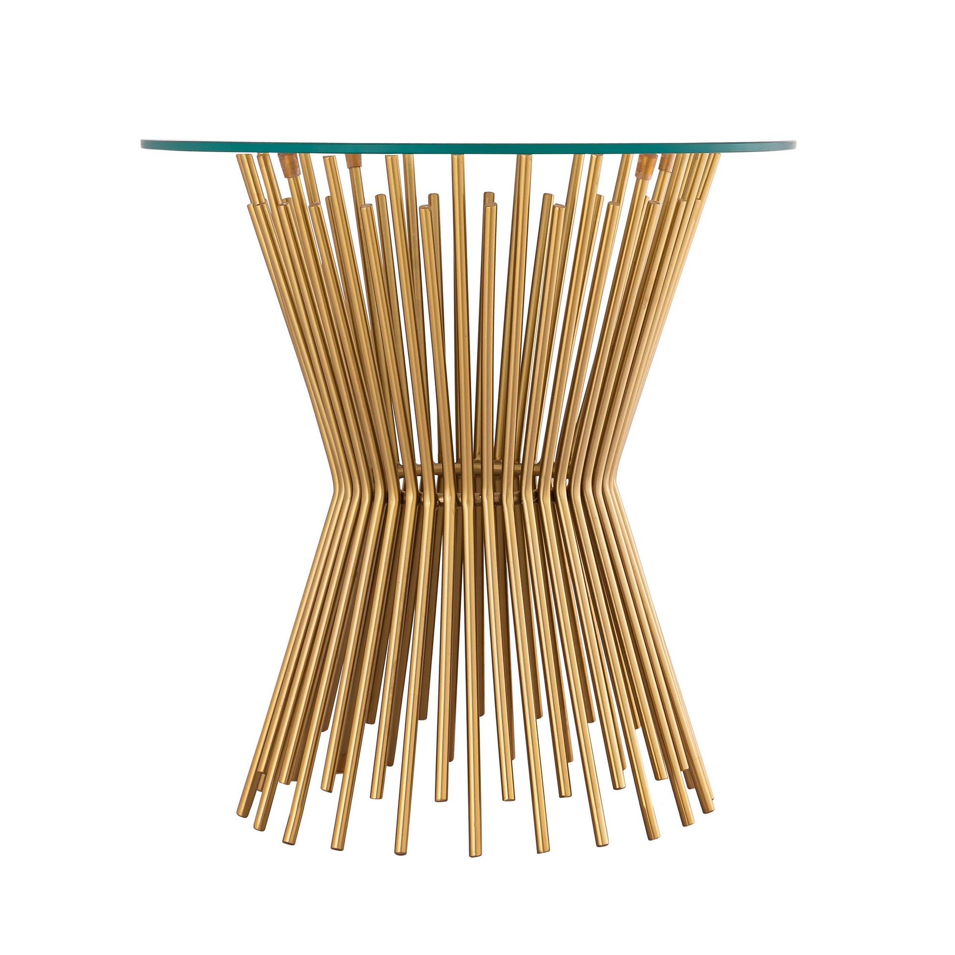 Enhance your home with this stylish Grace table from Inspire Me! Home Decor and TOV. A clear glass top sits on an hourglass pedestal base, furnished from individual iron spokes finished in satin gold. Available in coffee and side table sizes, this table will stand out alone or as a set.