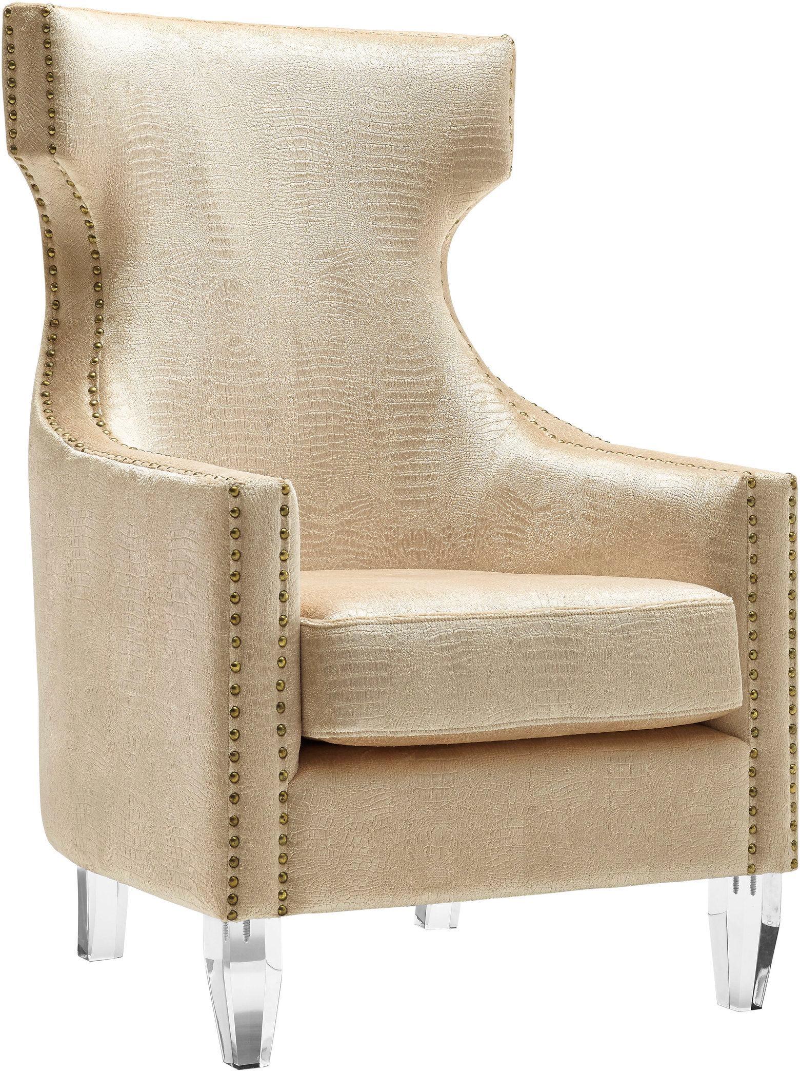 A stunning chair for a range of settings, this chair is made of hardwoods and finished in croc patterned gold velvet upholstery. The hand-applied gold nail head trim and stylish Lucite legs will give an air of extravagance to any room.