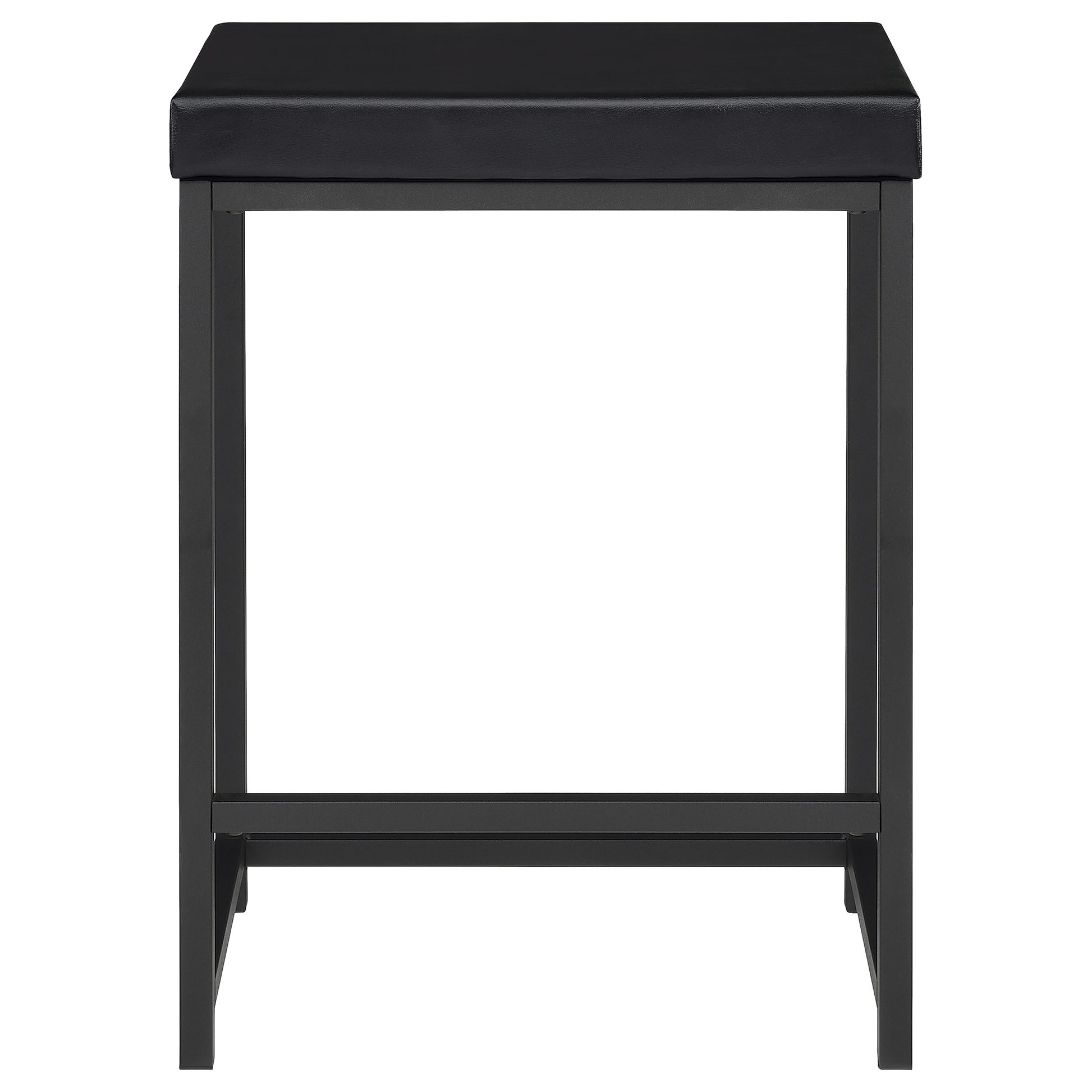 • Two stools are backless, with black finish bases and faux leather upholstery over foam padding