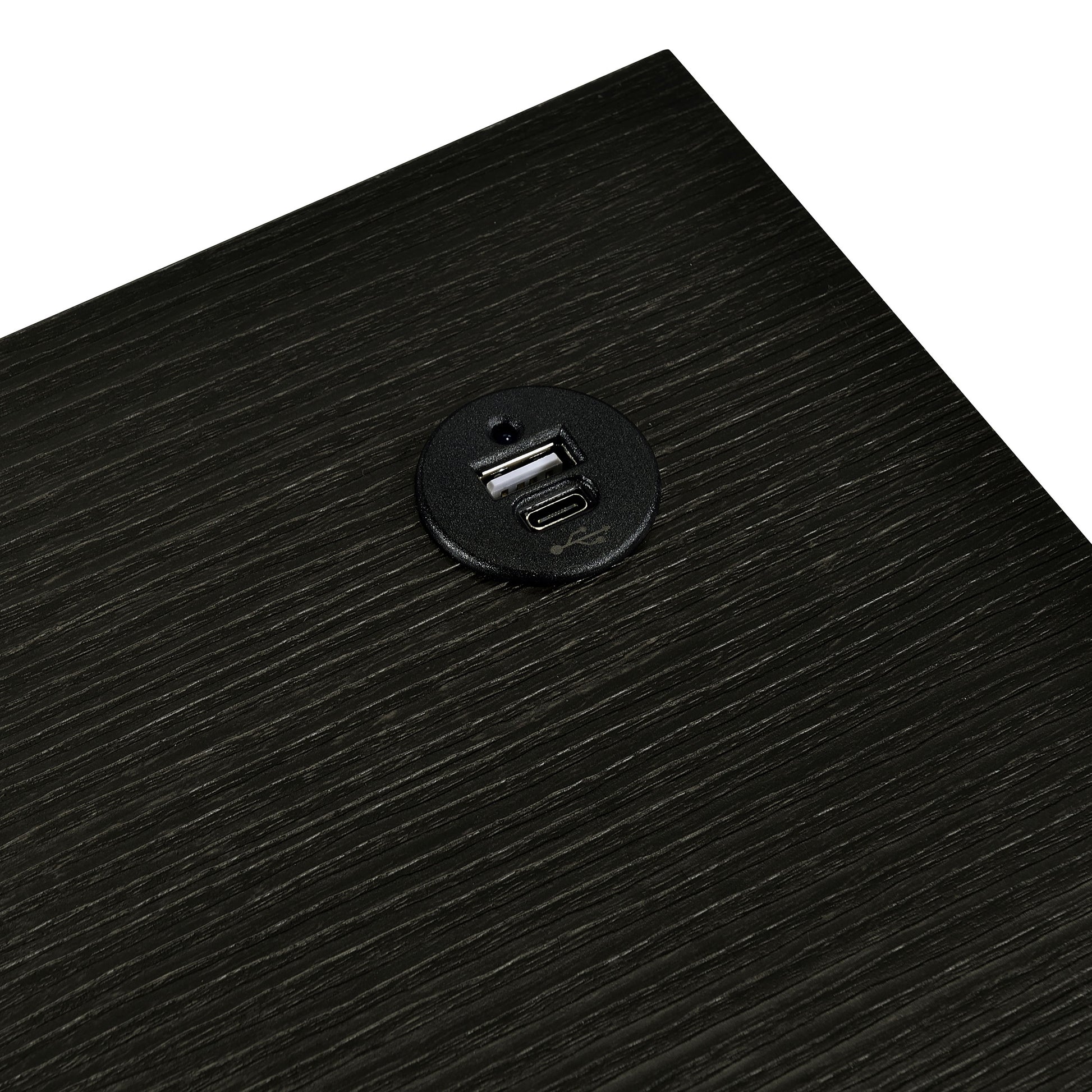 • Smaller table is on wheels and nests under the larger, which includes a USB port in the tabletop