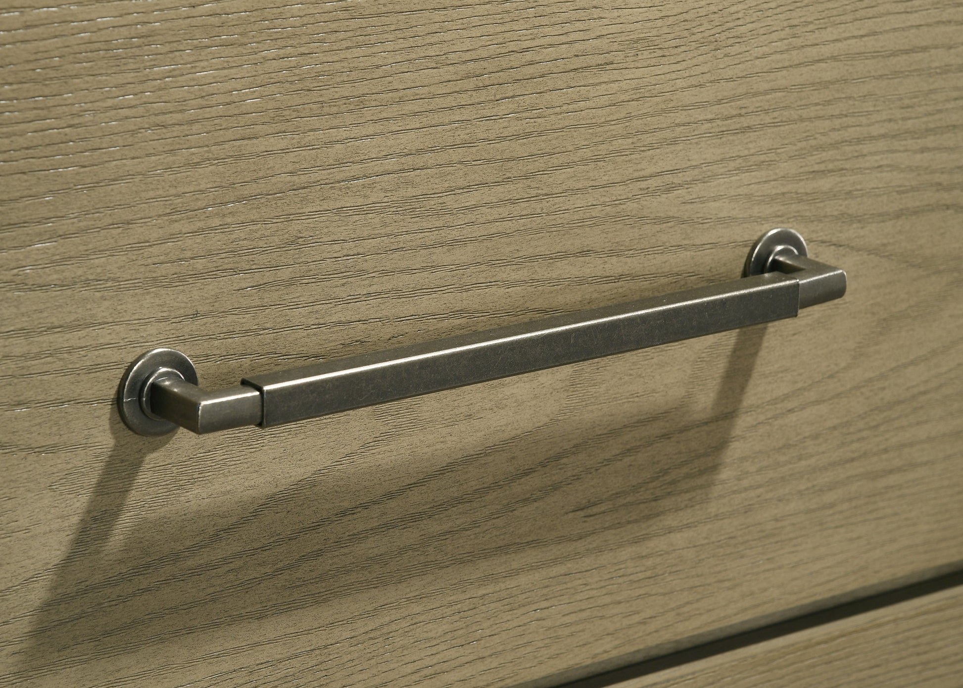 • Antique nickel metal knob and pull handles offer classic contrast and sculptural simplicity