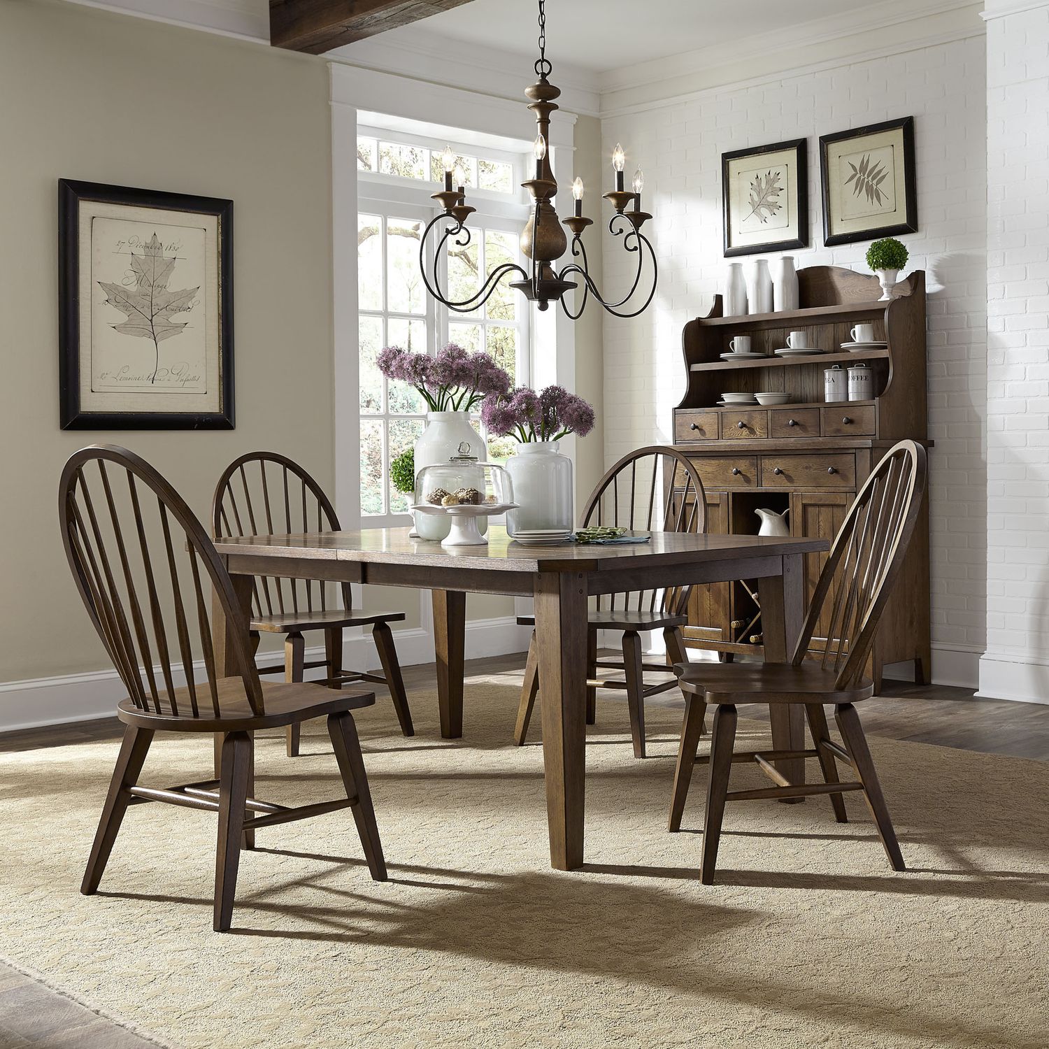 Wow family and friends with the Hearthstone Ridge five-piece rectangular table set. Crafted of rubberwood solids and oak veneers, this set features a tobacco and black finish and consists of the rectangular leg table and four Windsor back side chairs. The leg table has a planked top with canted corners and includes two 18” removable leaves that creates a grand scale. Wood and peg accents add to a craftsman feel. The table is anchored by thick tapered legs. The Windsor back side chairs are known for their comfort and durability. They feature a black finish, a saddle shaped seat for added comfort, and splayed legs with nylon chair glides to protect your flooring. Hearthstone Ridge is a casual, rustic style that never goes out of fashion.
