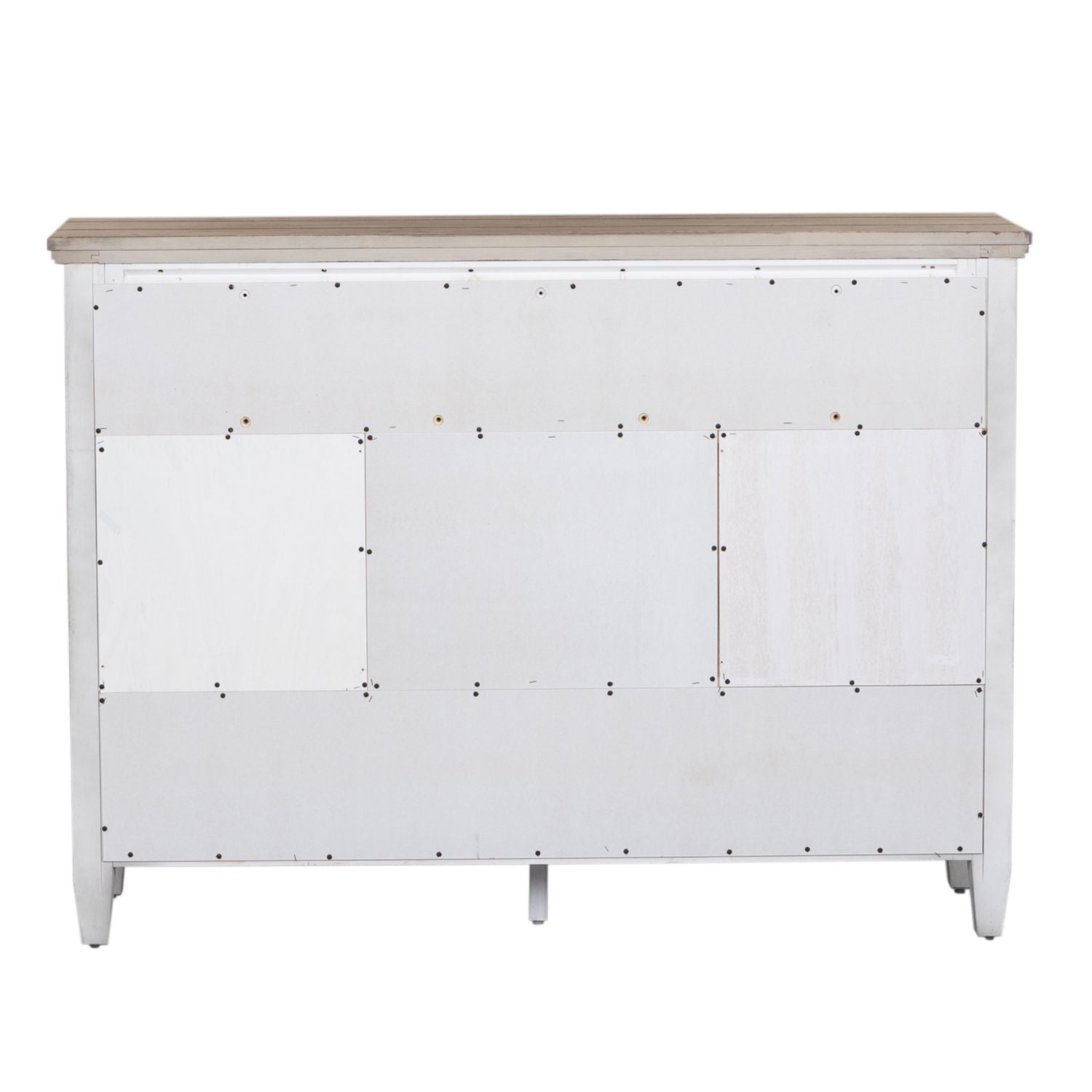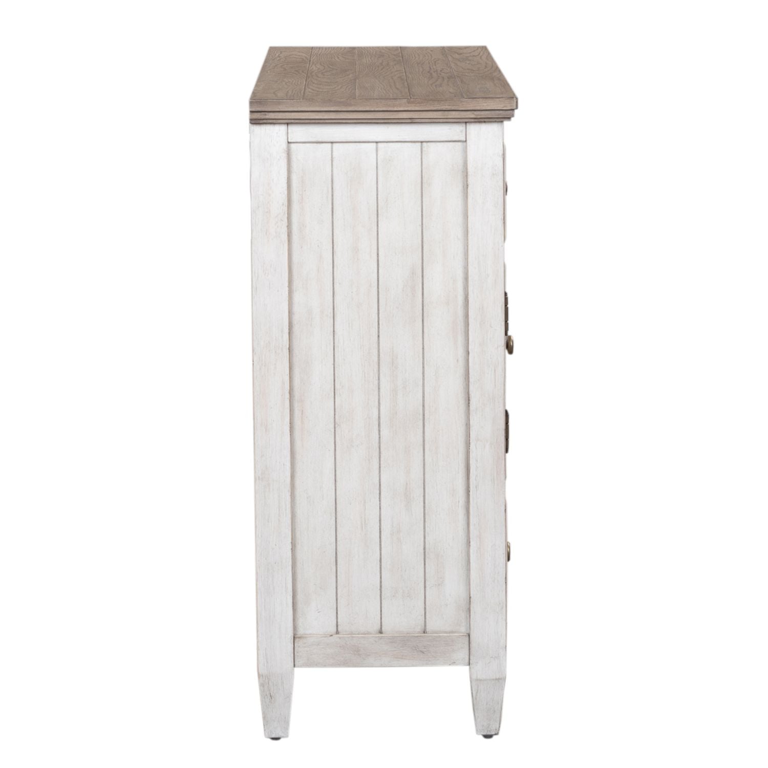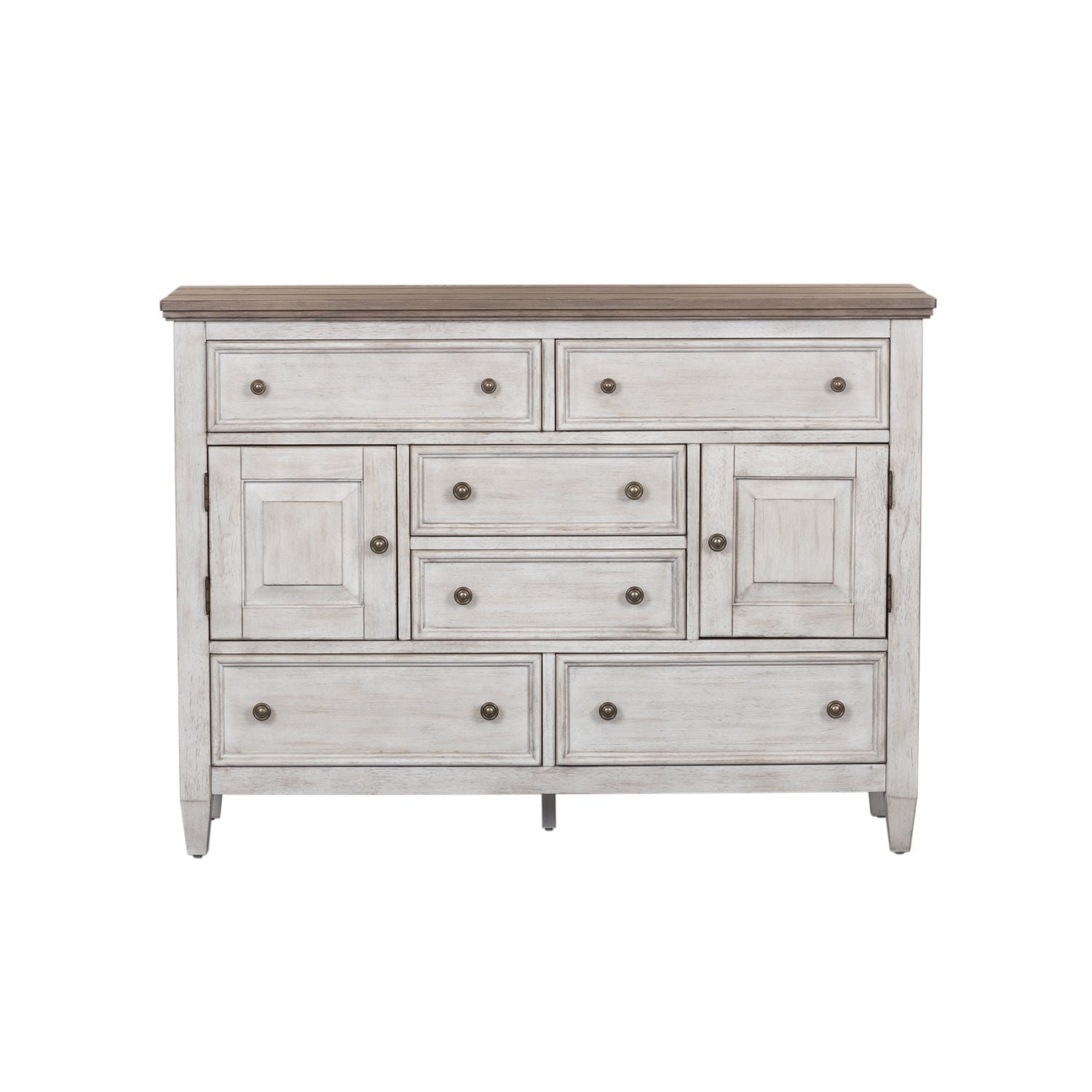 When details matter, choose the Heartland chesser. Crafted of rubberwood solids with cathedral white oak and birch veneers, this piece features an antique white finish with tobacco tops, planked top and end panels, full extension drawers with premium felt lined top drawers and cedar lined bottom drawers, wood framed drawer fronts, and is accented with antique brass knob hardware. This dresser offers six drawers and two doors for optimal storage. Heartland is a beautiful collection in farmhouse styling with unique characteristics that give it an antique appeal.