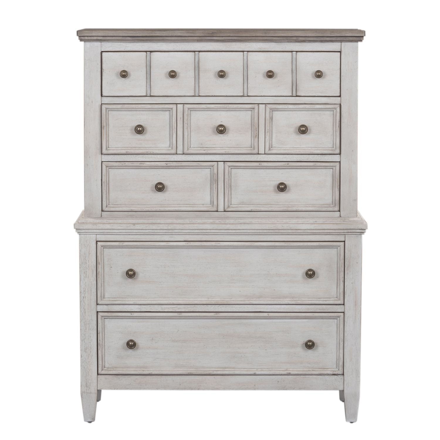 Elevate your farmhouse style home with the Heartland optional queen panel bed, dresser, mirror, chest, and nightstand. Crafted of rubberwood solids with cathedral white oak and birch veneers, this kit features an antique white finish with tobacco tops, planked tops and end panels, full extension drawers with premium felt lining in the top drawers and cedar lining in the bottom drawers, wood framed drawer fronts, and is accented with antique brass knob hardware. This optional panel bed features beautiful antique ceiling tile panels, heavy top crown molding and raised panels on the footboard. The dresser offers optimal storage with nine drawers including a unique bluff-cut top center drawer. Pair the landscape mirror with this dresser, that offers a beveled edge and bead molding, and is anchored by bolt-on supports. The chest offers five drawers but gives the illusion of many more. The nightstand is unique in that it offers you one drawer as well as two open stationary shelves in front of a planked back panel. Utilize the nightstands built in charging system, complete with two outlets and two USB ports. Add this one-of-a-kind bedroom kit to your beautiful home.