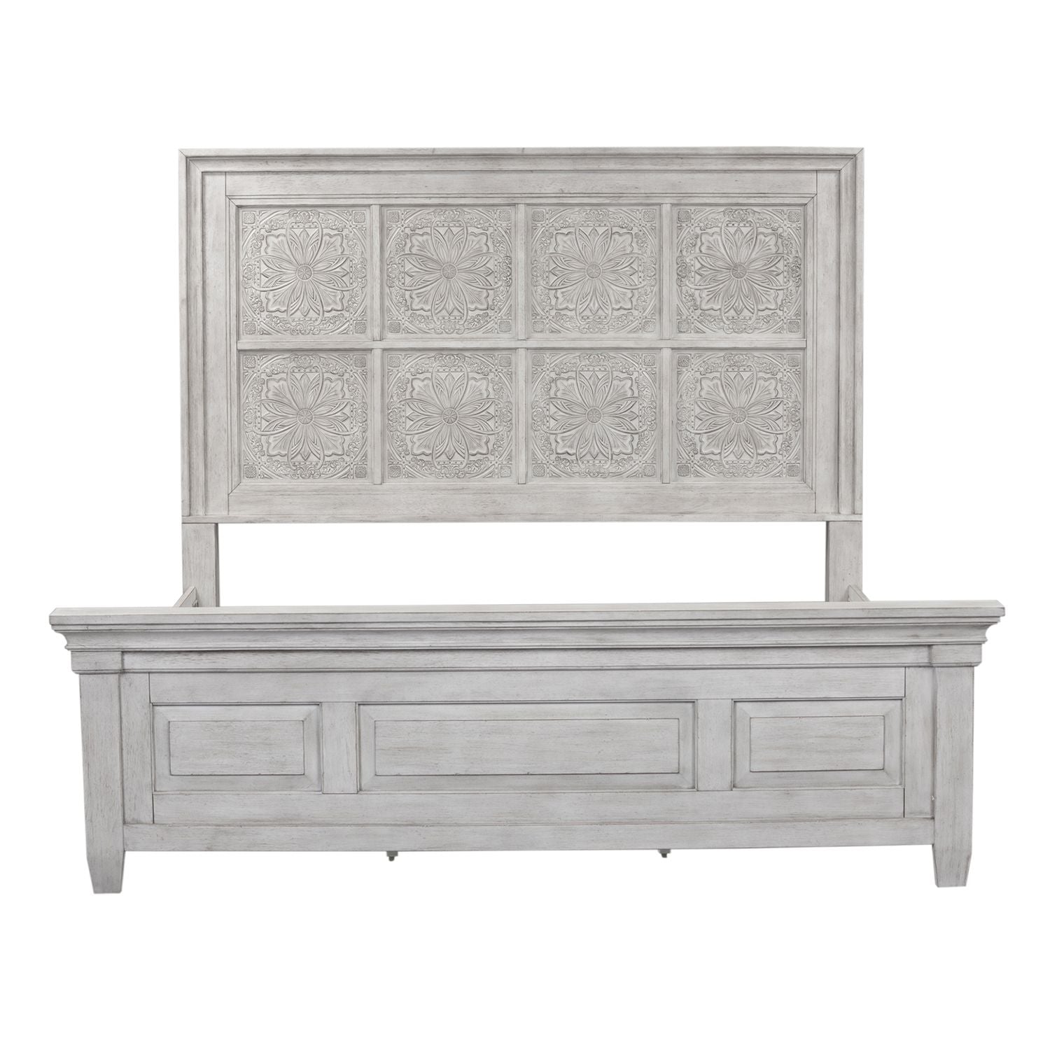 Elevate your farmhouse style home with the Heartland optional queen panel bed, dresser, mirror, and nightstand. Crafted of rubberwood solids with cathedral white oak and birch veneers, this kit features an antique white finish with tobacco tops, planked tops and end panels, full extension drawers with premium felt lining in the top drawers and cedar lining in the bottom drawers, wood framed drawer fronts, and is accented with antique brass knob hardware. This optional panel bed features beautiful antique ceiling tile panels, heavy top crown molding and raised panels on the footboard. The dresser offers optimal storage with nine drawers including a unique bluff-cut top center drawer. Pair the landscape mirror with this dresser, that offers a beveled edge and bead molding, and is anchored by bolt-on supports. The chest offers five drawers but gives the illusion of many more. The nightstand is unique in that it offers you one drawer as well as two open stationary shelves in front of a planked back panel. Utilize the nightstands built in charging system, complete with two outlets and two USB ports. Add this one-of-a-kind bedroom kit to your beautiful home.