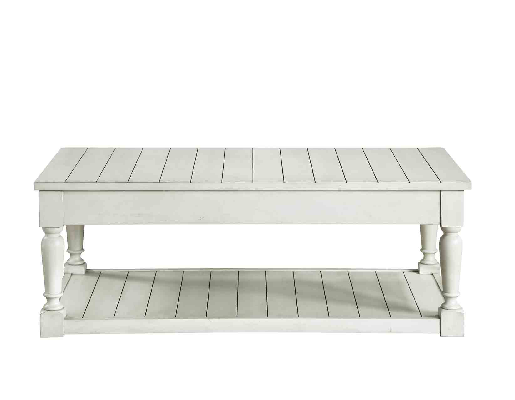 Cottage styling in a Lift-Top Cocktail Table that lets you work or eat while seated on your Sofa. The Hemingway Cocktail features classic cottage design like turned legs, plank top and an alabaster finish. The plinth base offers a sturdy foundation to anchor the Lift-Top convenience of the table. A bottom shelf offers additional storage or display options while two storage pockets underneath the lift-top offer convenient storage for remotes or other items.