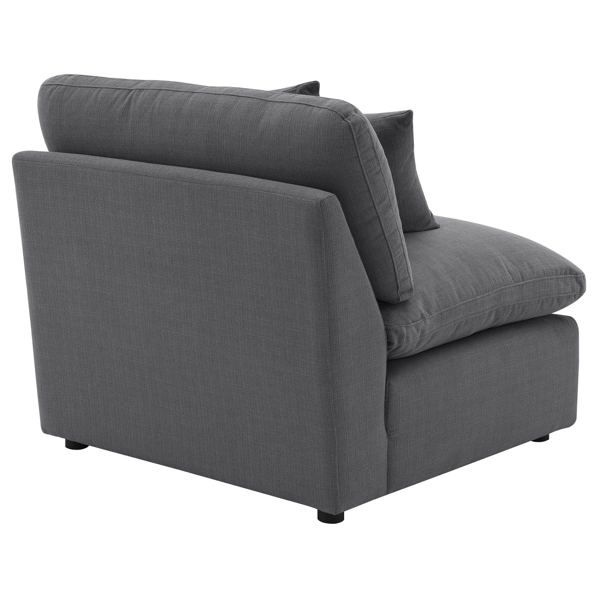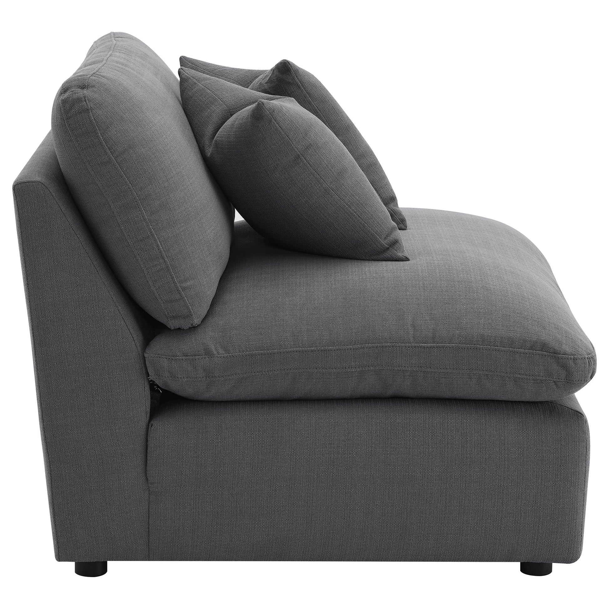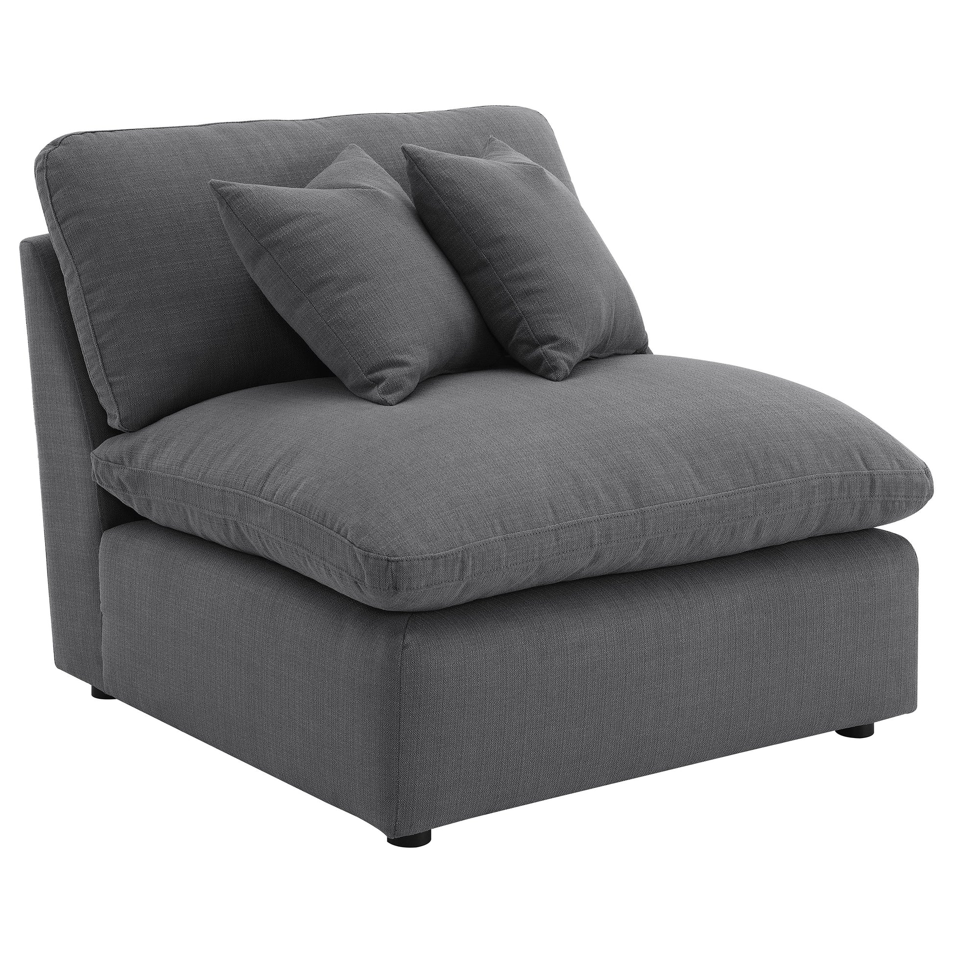 • Armless chair in charcoal fabric with modern lines and tailored stitched detail