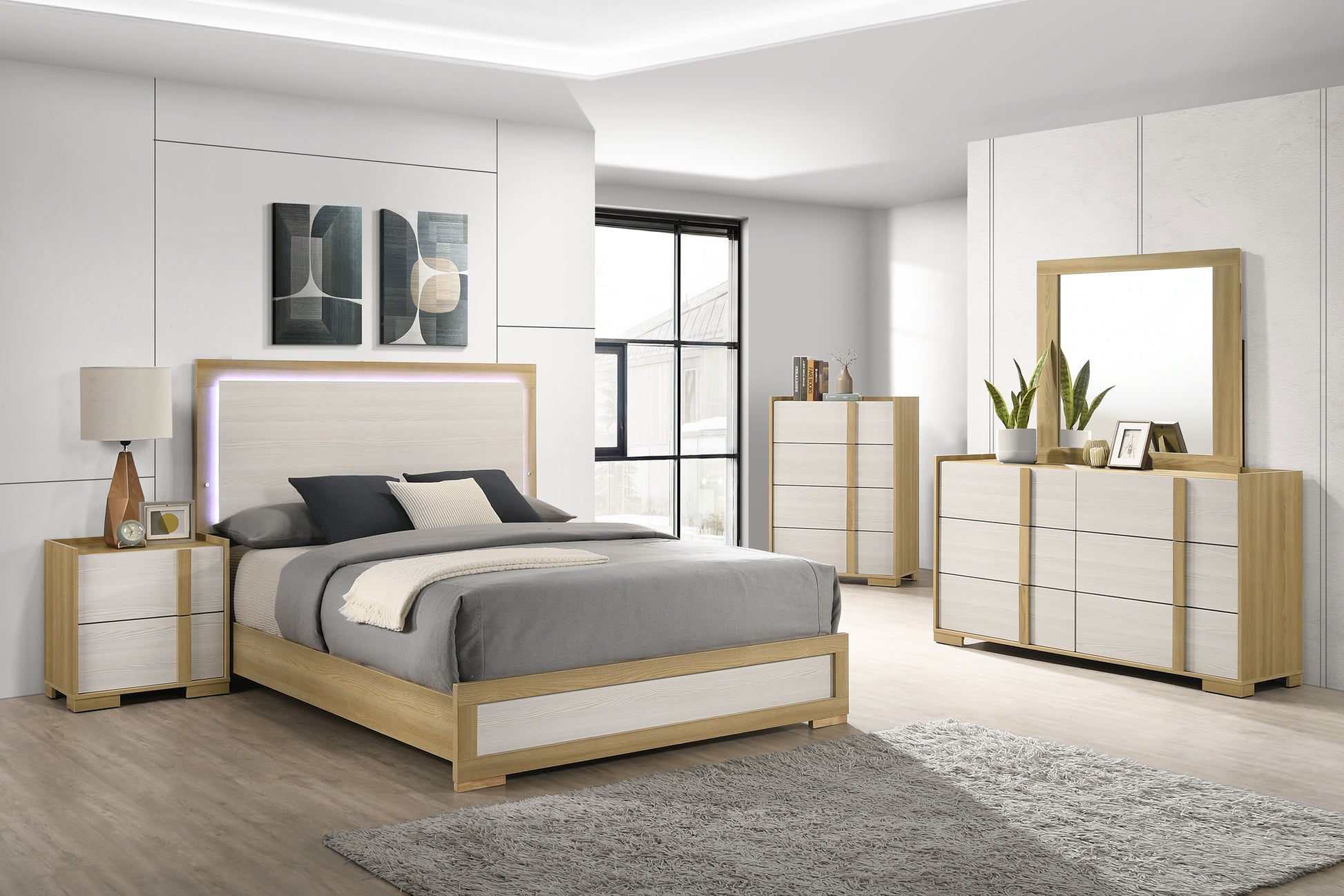 • Blends natural wood tones and crisp white panels for a modern, elegant appearance