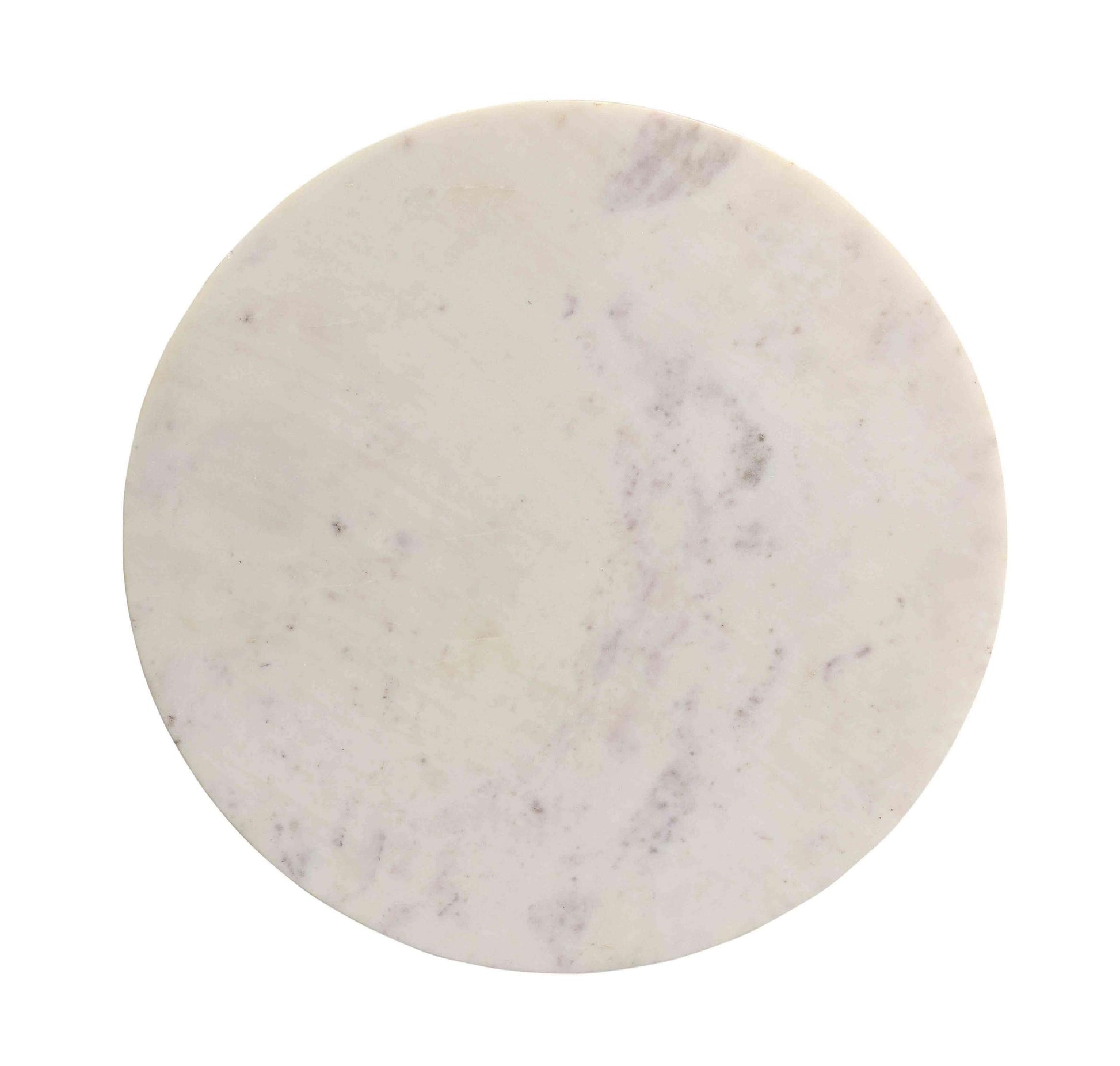 Hand-hammered antique brass ovals act as a solid base for a white marble top. Available in two sizes, this eye-catcher shines alone and as a set.