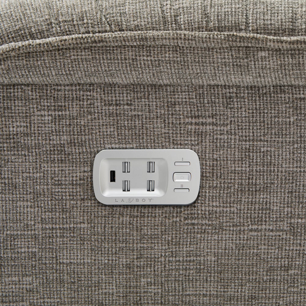 The Jay Power Reclining Loveseat with Headrest, Lumbar and Console has a casual flow and convenient storage for drinks and remotes. Welt trim and softly sloped arms add verve to clean-lined cushioning while headrest and lumbar offer optimal support.
