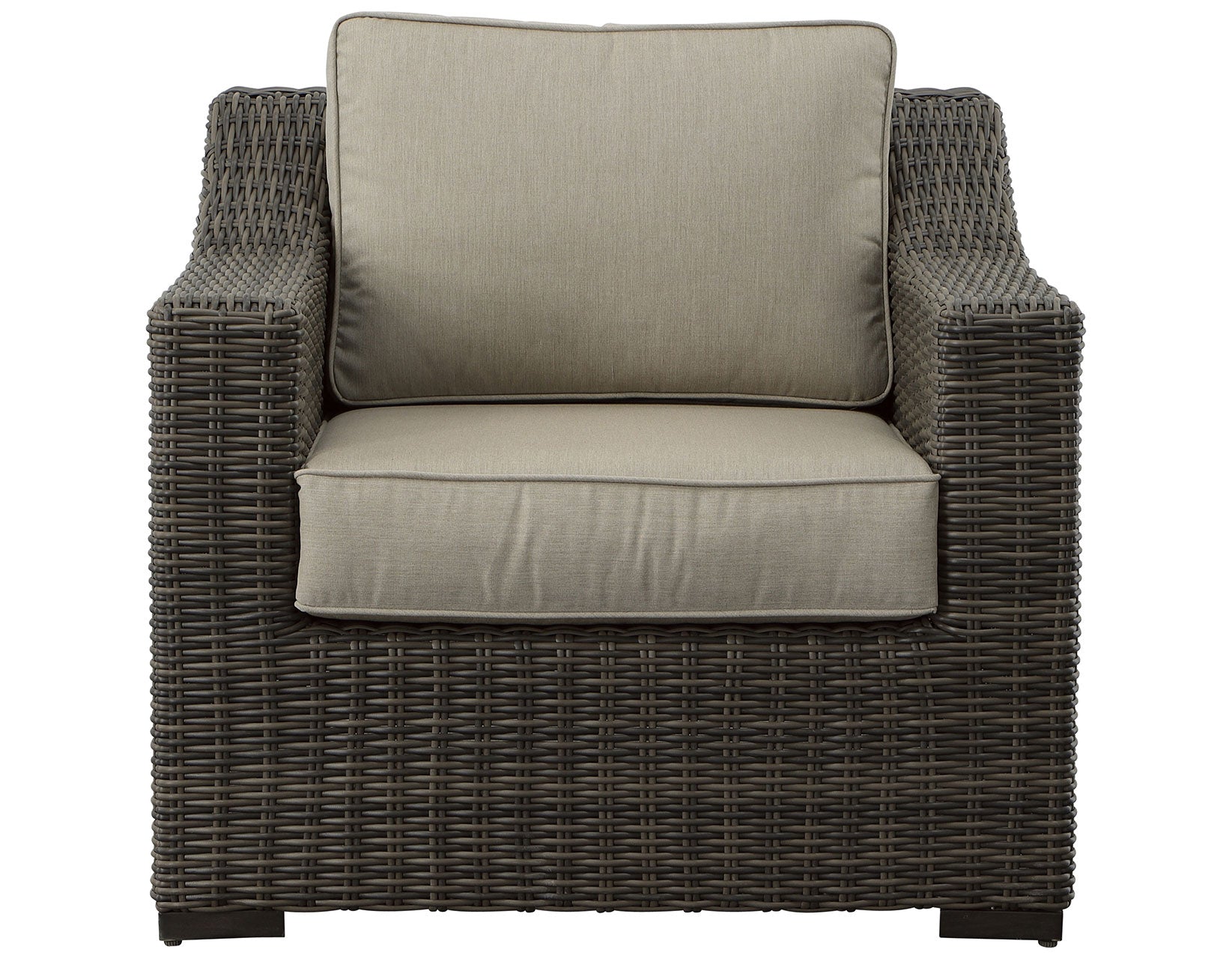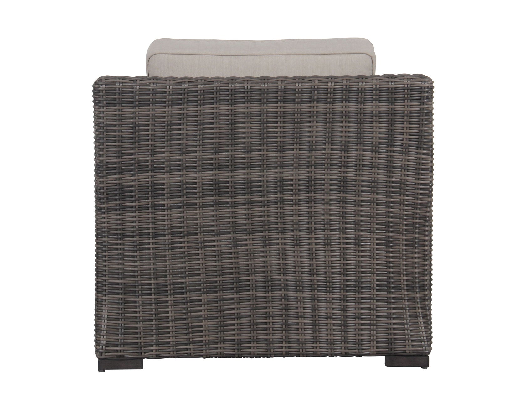The Jones seating group offers a classic Sofa and Chair combination in a full-round resin wicker package. The matching chair is available in stationary or full-swivel models. The dark gray aluminum Coffee Table proves a suitable companion to the seating with its mission influences and bottom shelf.