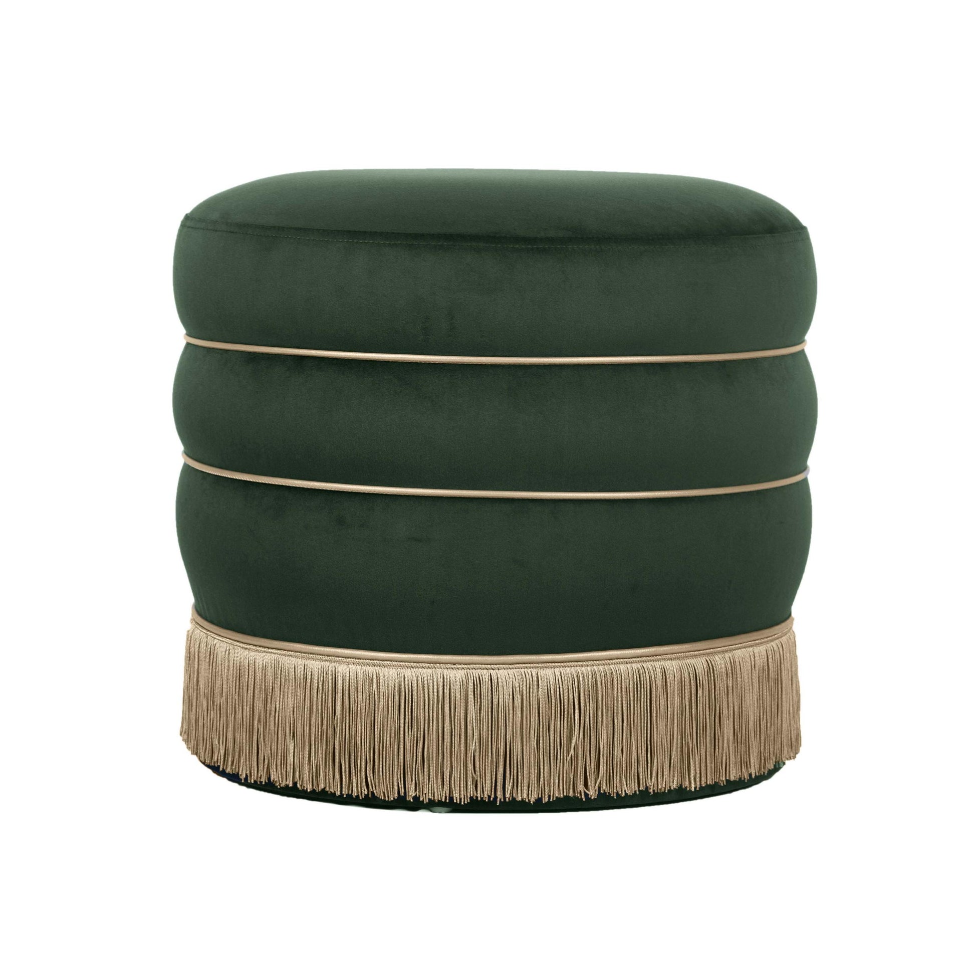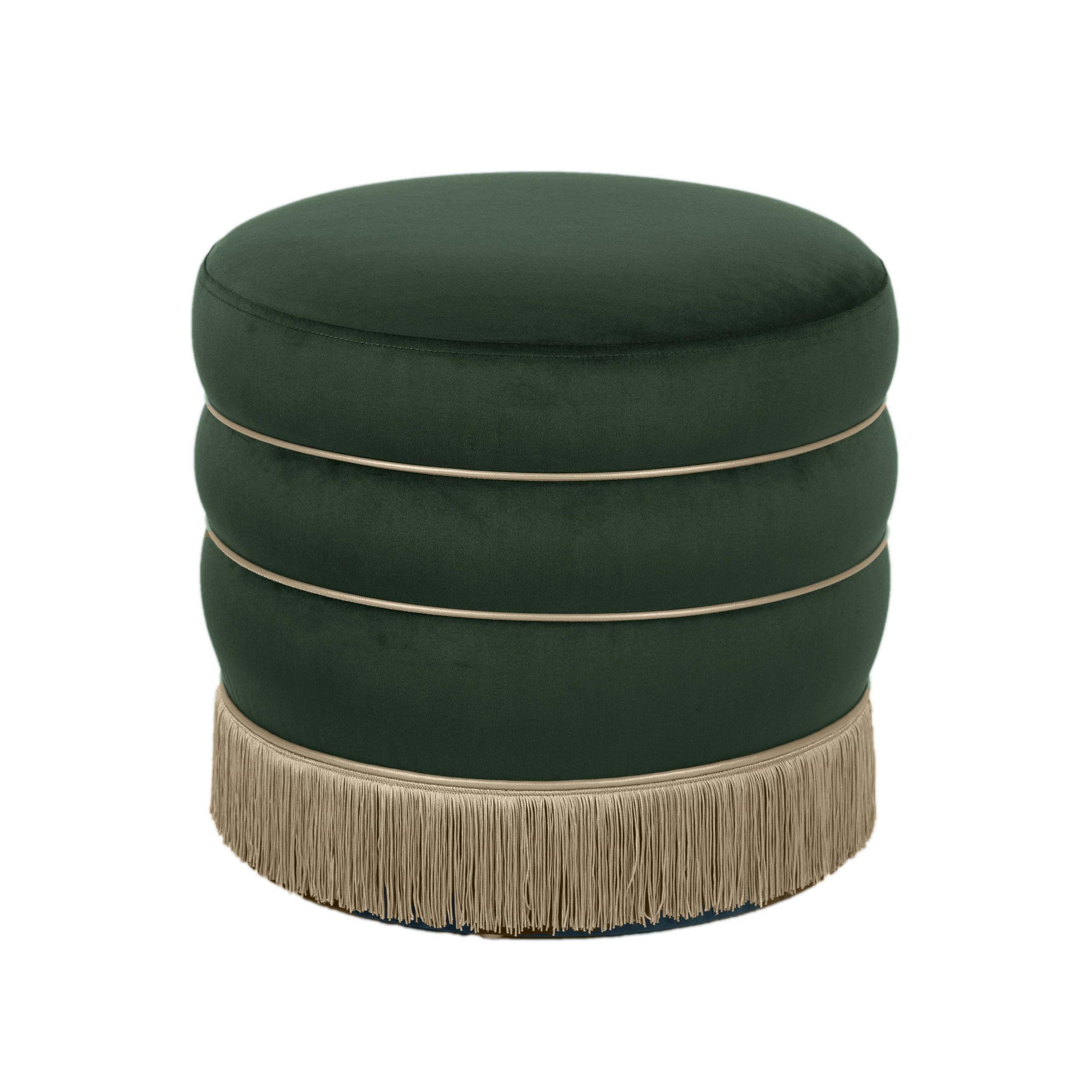 Retro meets modern with the Lakka ottoman. This intricately designed ottoman features luxurious velvet upholstery and vegan leather piping while its tasseled base completes the look. Available in multiple colors to suit your decor
