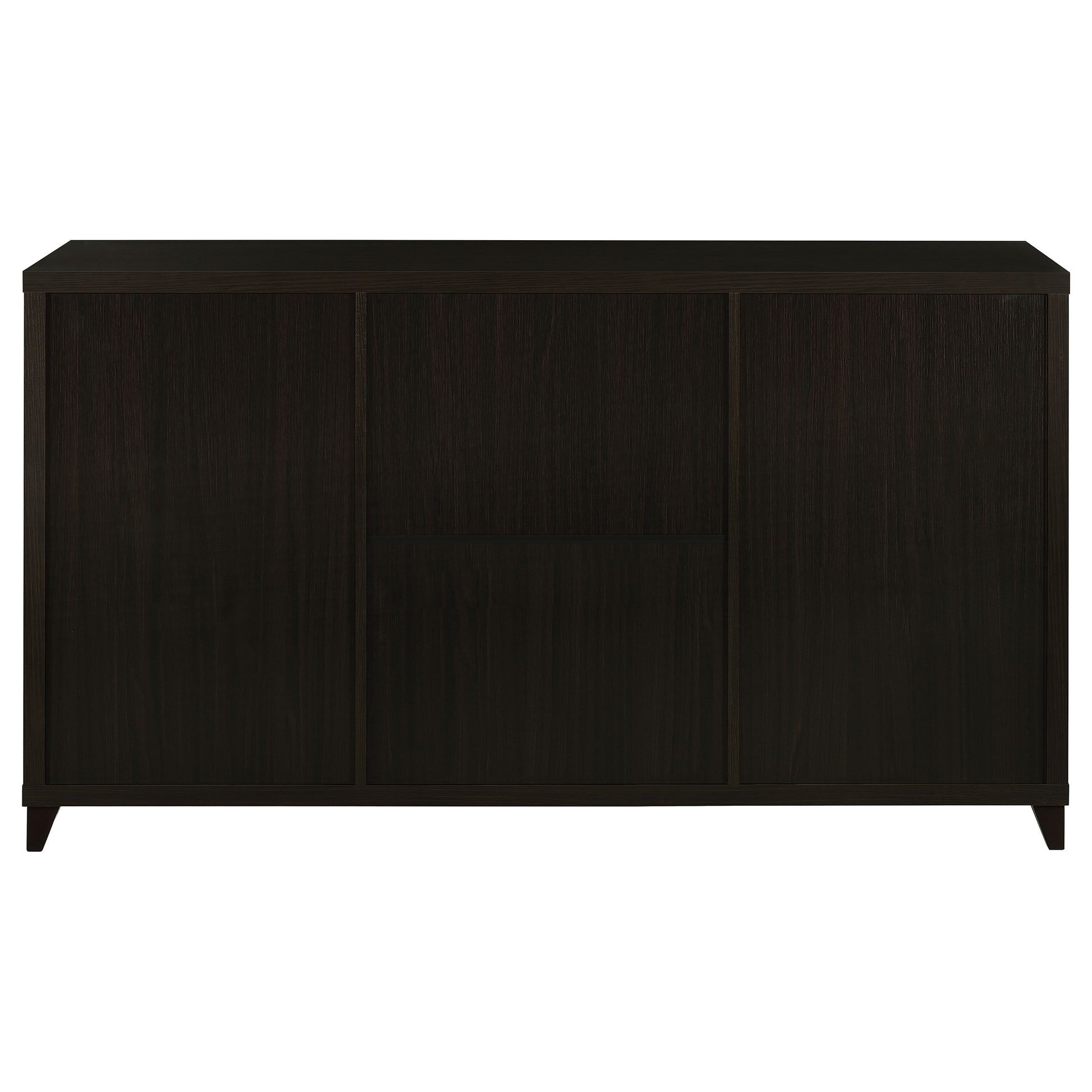 • Cappuccino 60-inch TV stand with modern silhouette and brushed silver hardware