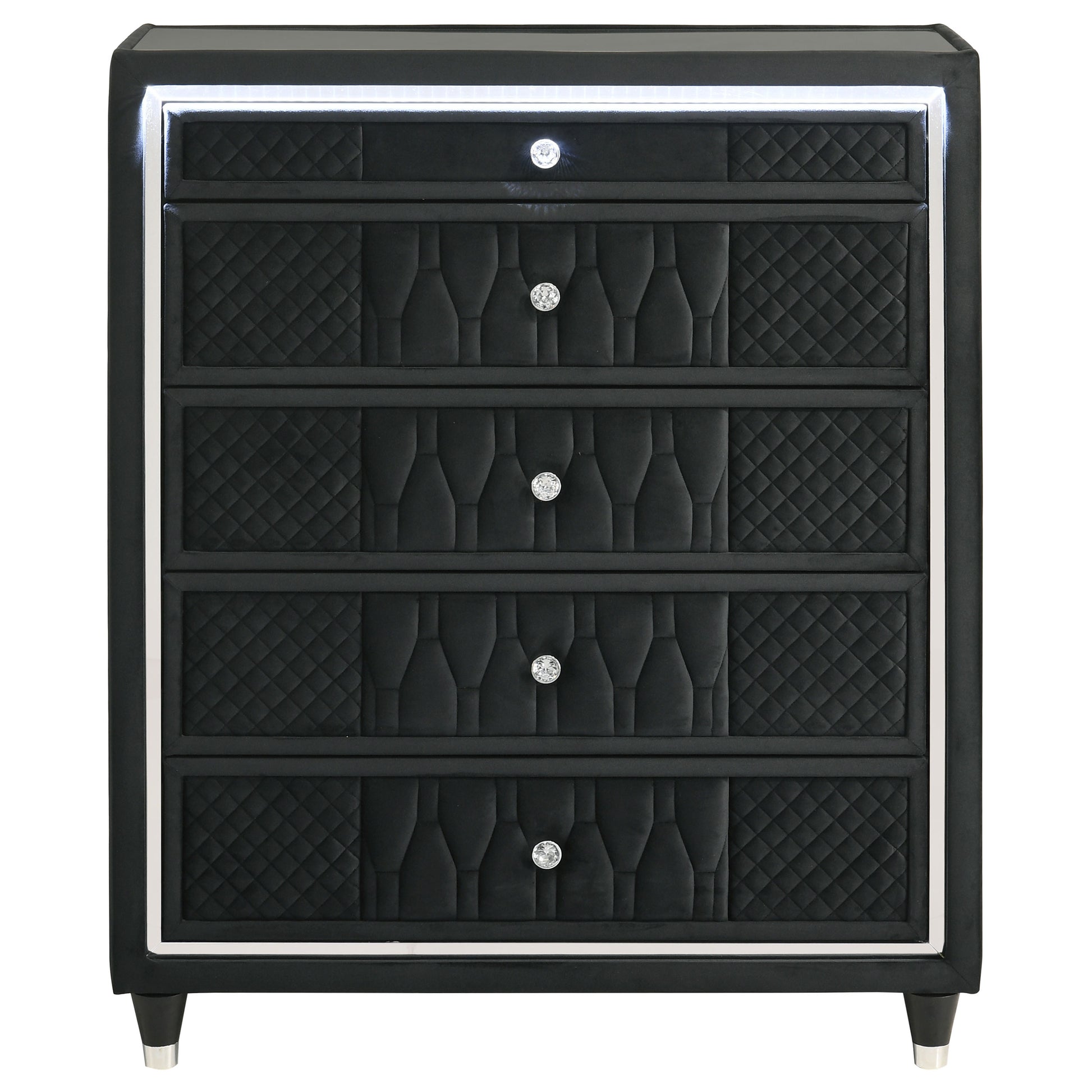 Embrace elegance in full velvet with this five-drawer chest, where ambient lighting meets refined craftsmanship. Upholstered in a stunning black velvet, each drawer is adorned with quilted textures, reflective acrylic accents, and crystal knobs for a soft yet glamorous presence. Integrated LED lighting casts a warm glow, while the black felt-lined top drawer, English dovetails, tempered glass top, and metal extension glides elevate everyday function. Supported by solid rubberwood legs, this chest blends softness with luminous charm.