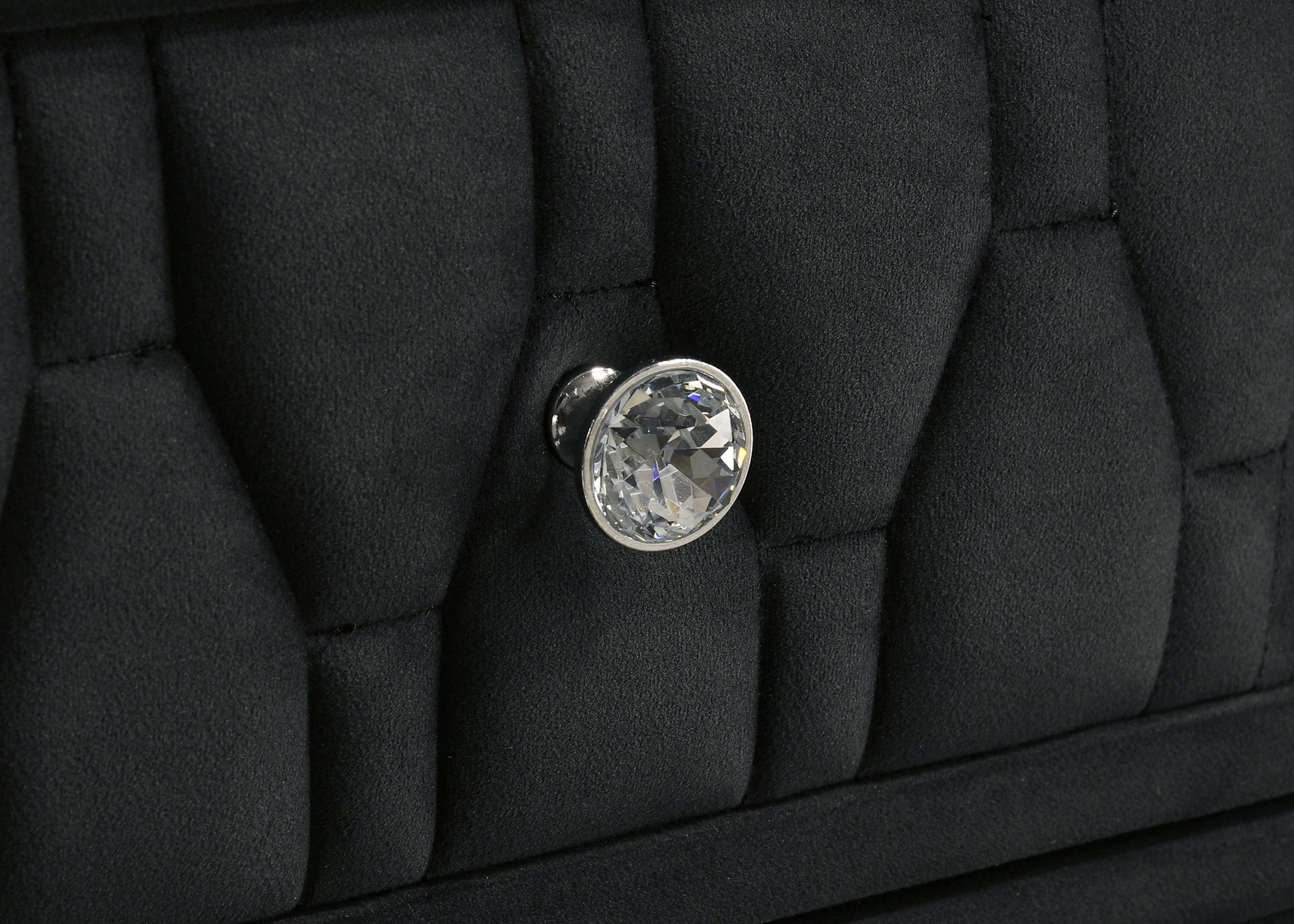 Warmth meets radiance in this dresser and mirror set, where black velvet surround every surface. A built-in flame visualizer sits beneath a clear tempered glass top, with LED case lighting adding atmosphere. The tri-panel mirror features LED illumination to complete the glow. Finished with crystal knobs, quilted velvet fronts, and felt-lined drawers, this set pairs soft elegance with practical brilliance, all lifted by solid rubberwood legs.
