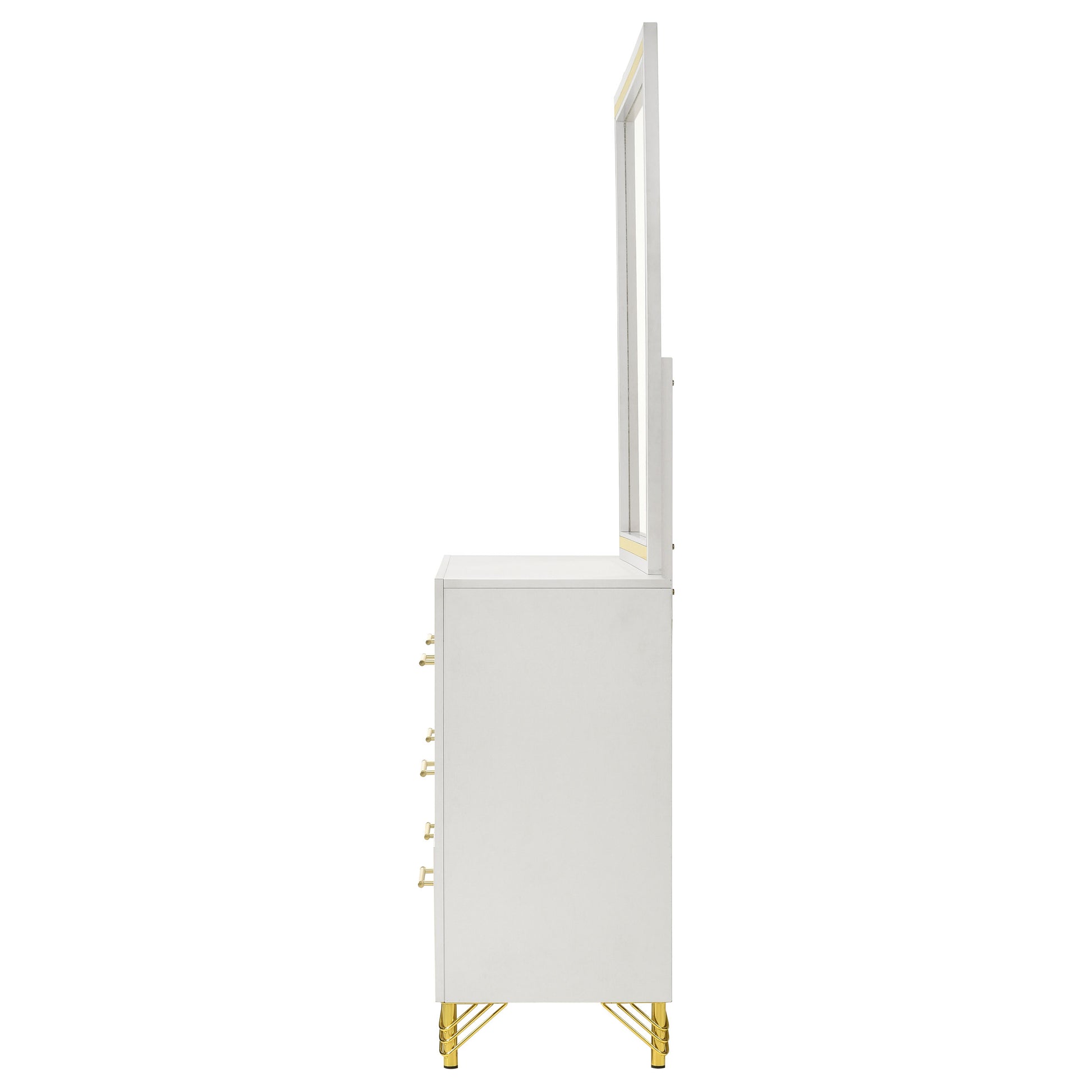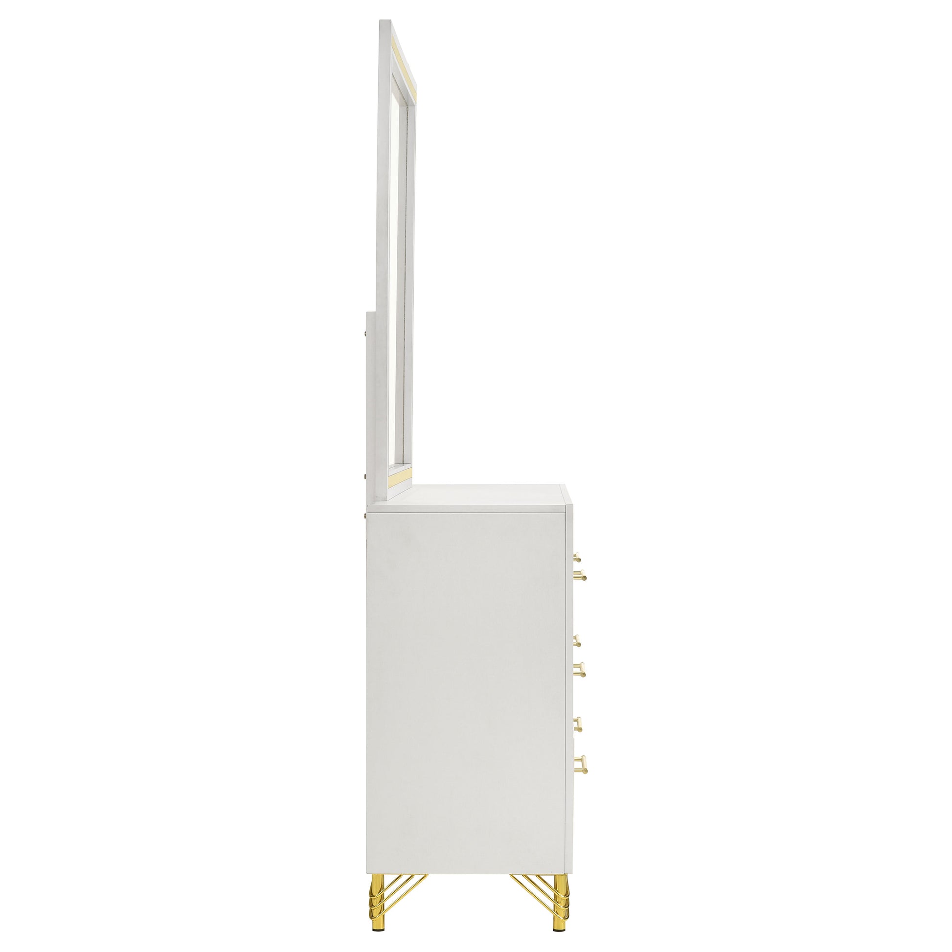 • Glam flair infuses a modern six-drawer dresser and mirror set to offer a bright, bold addition in any bedroom