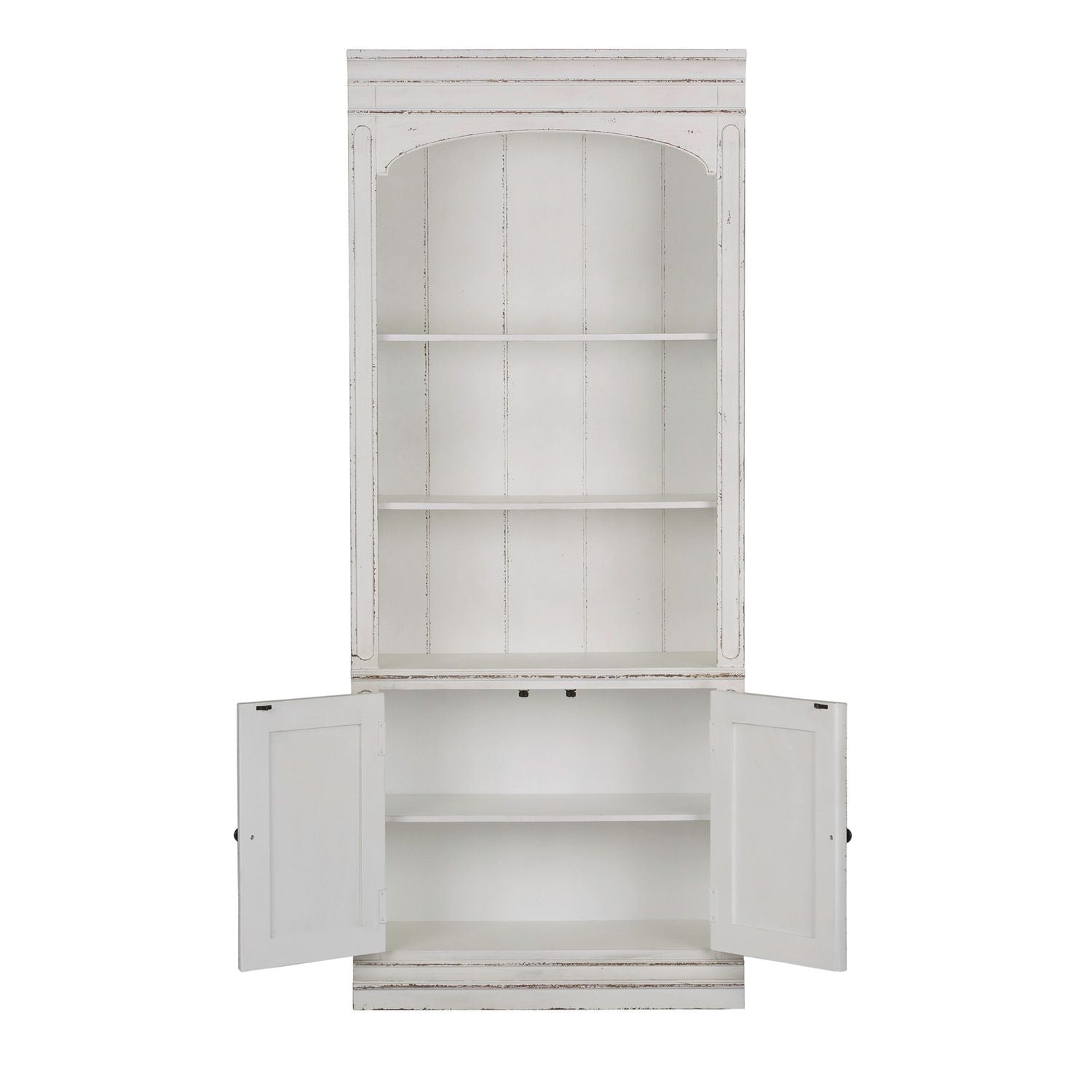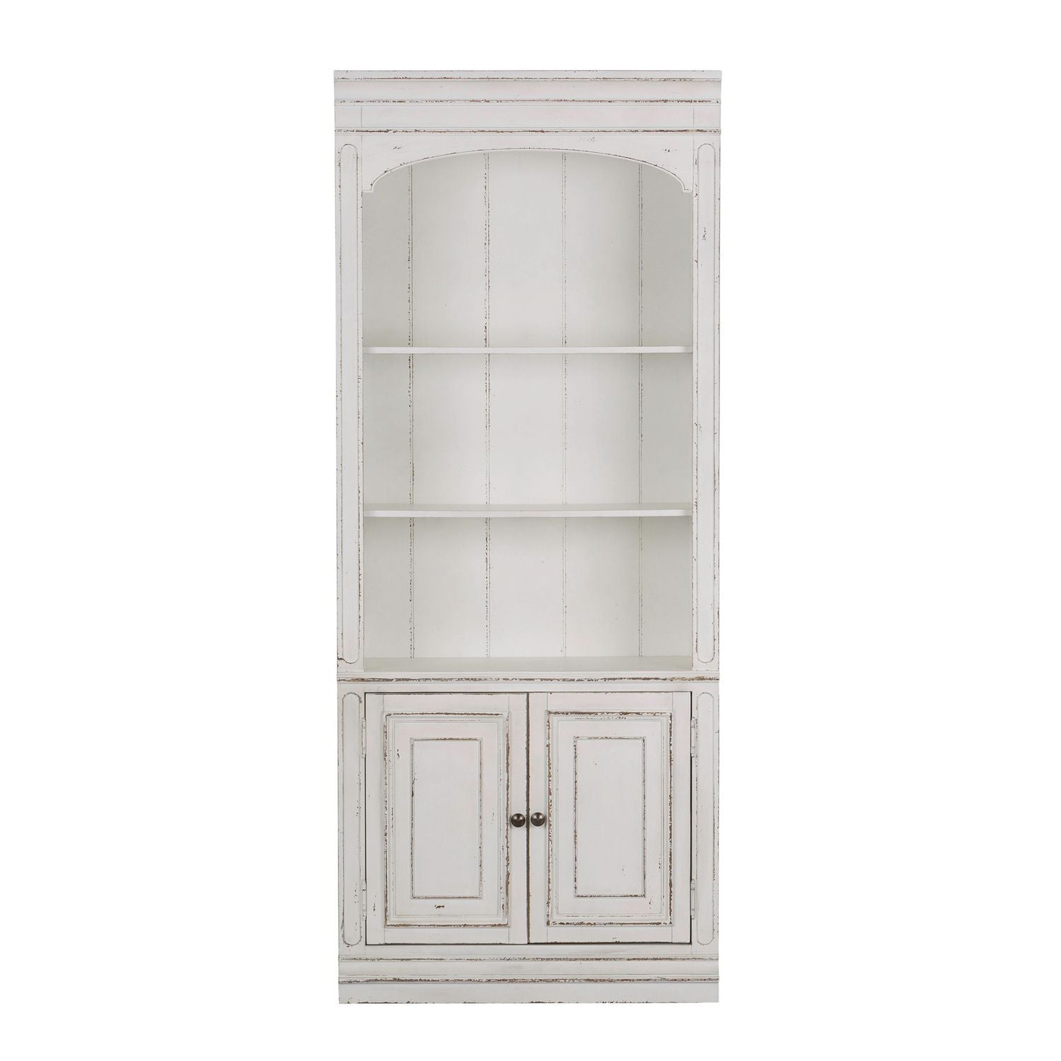 Accent your space with the perfect blend of European Traditional design, using this unique Magnolia Manor 78" bunching bookcase. Crafted with poplar and rubberwood solids with white oak and birch veneers, this piece features an antique white finish, adjustable shelving, cabinet storage, bead molding, and a flush fit to the wall accented by knob hardware in an antiqued pewter. Warm antique finishes and artistic distressing along with grand scale a group to be passed to generations.